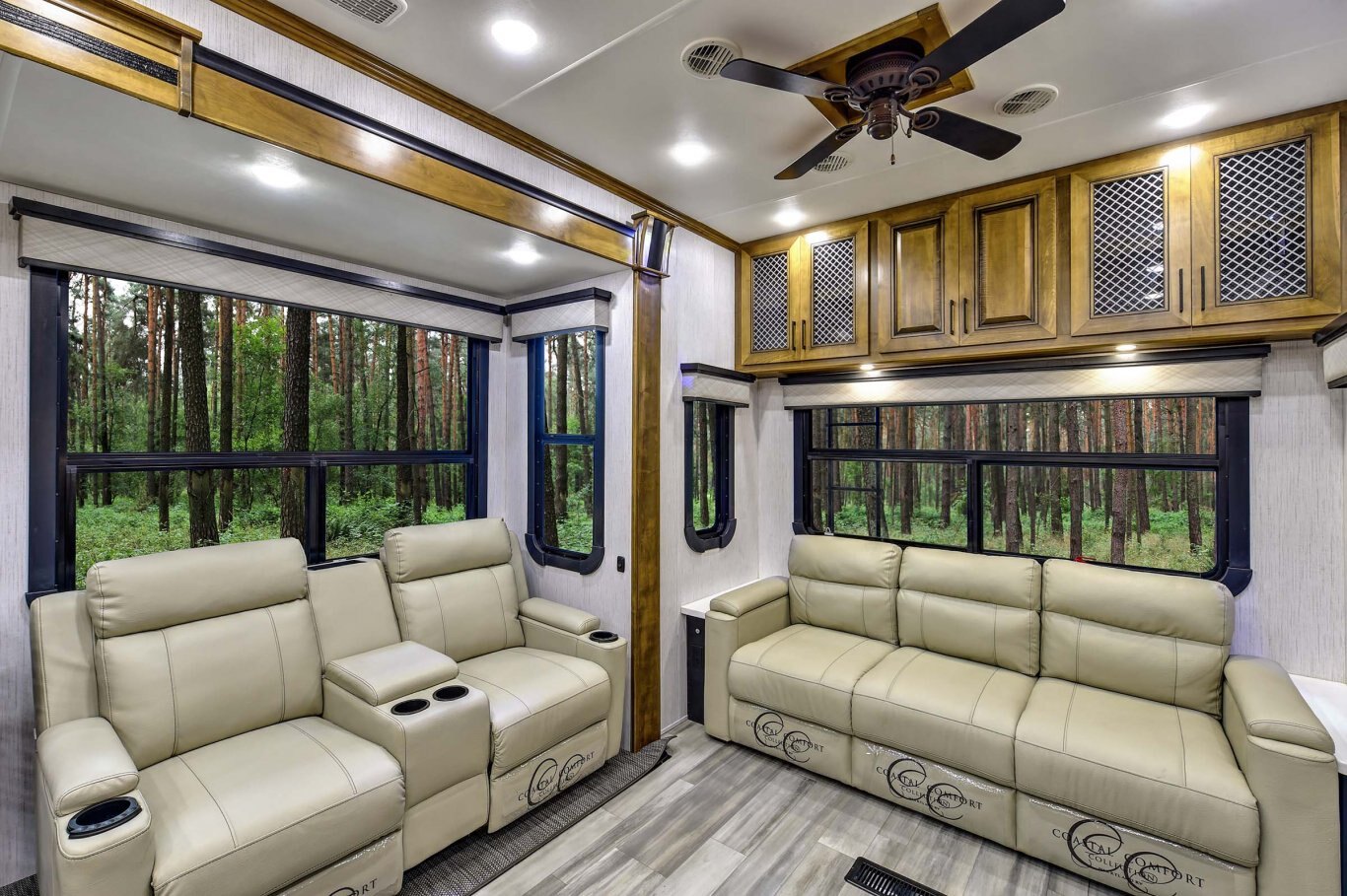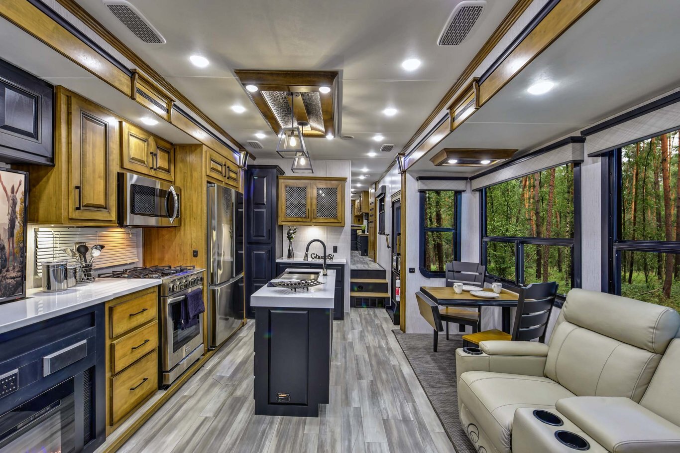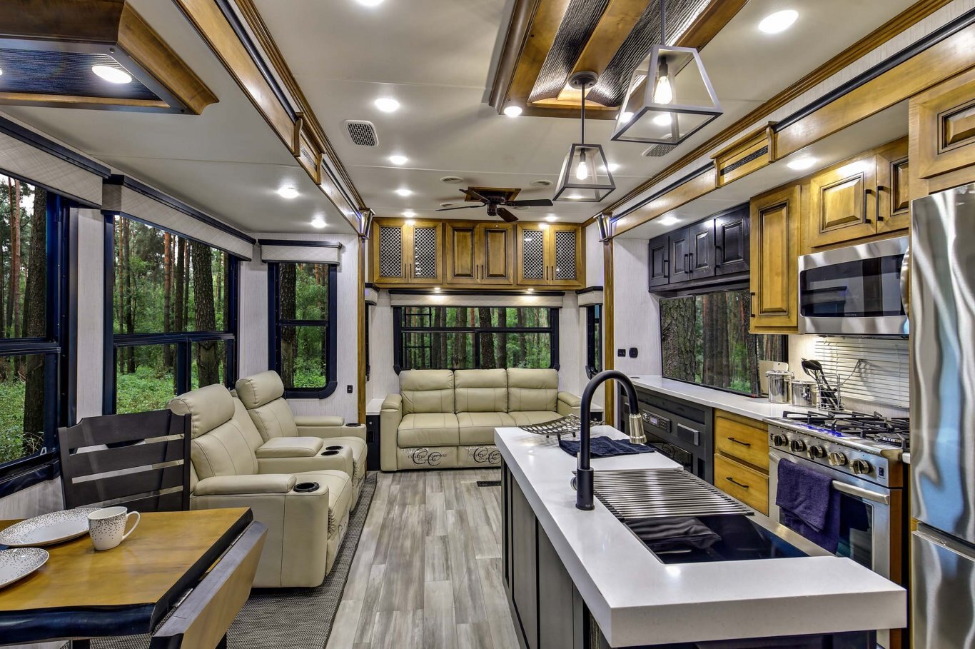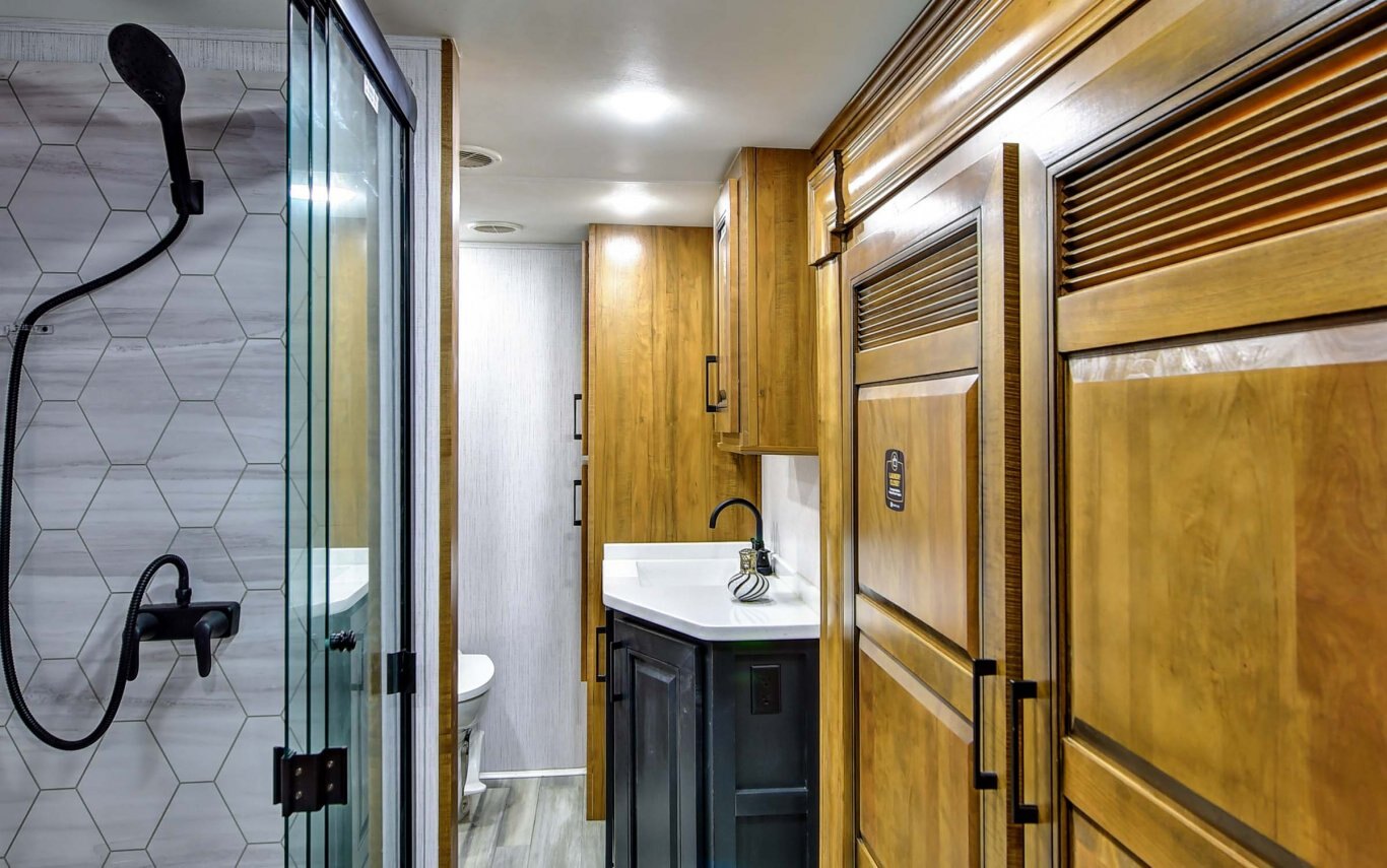 INTERIOR FEATURES Triple Top” 3 separate kitchen surface workspaces for superior kitchen flow (most floor plans) “True Wood” 100% maple hardwood cabinetry & fascia in dynamic “Black and Tan” 2-tone wood package “Spa Baths” with solid surface sinks, marble look shower, removable shower head and teak wood seat Straight roof line and ‘elite height’ main slides for increased space and storage In-house constructed vacuum-bonded laminated main and upper deck floors Night roller shades Power theater seating with heat and massage Dual panoramic windows in main slide Whisper quiet A/C system – includes dual high output 15,000 BTU A/C units (3rd AC option) 55˝ LED living room television
