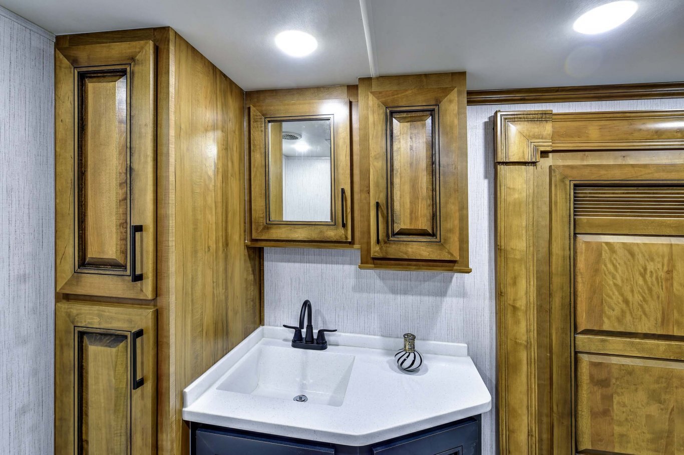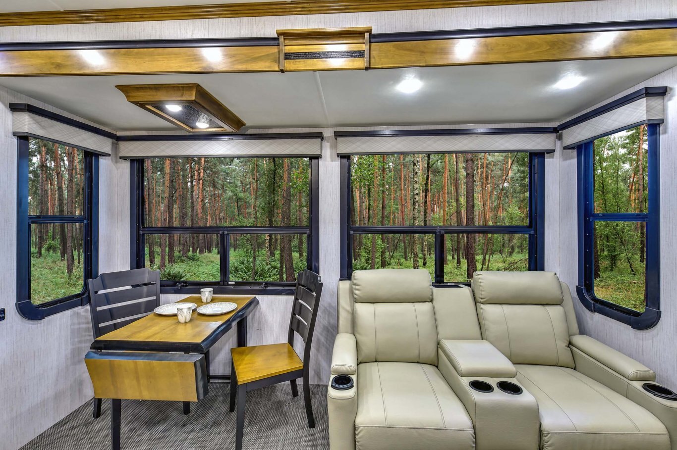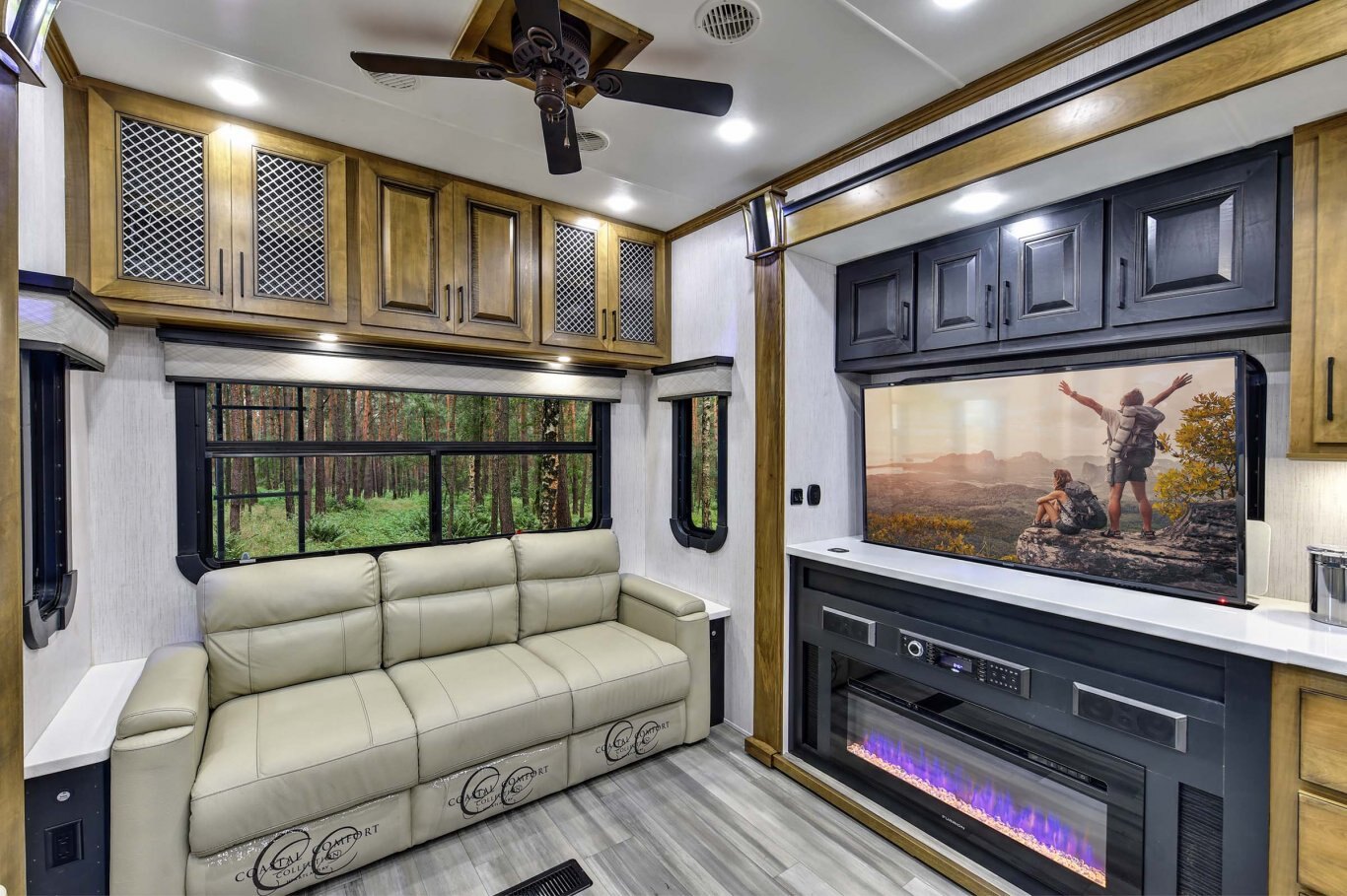 INTERIOR FEATURES Triple Top” 3 separate kitchen surface workspaces for superior kitchen flow (most floor plans) “True Wood” 100% maple hardwood cabinetry & fascia in dynamic “Black and Tan” 2-tone wood package “Spa Baths” with solid surface sinks, marble look shower, removable shower head and teak wood seat Straight roof line and ‘elite height’ main slides for increased space and storage In-house constructed vacuum-bonded laminated main and upper deck floors Night roller shades Power theater seating with heat and massage Dual panoramic windows in main slide Whisper quiet A/C system – includes dual high output 15,000 BTU A/C units (3rd AC option) 55˝ LED living room television