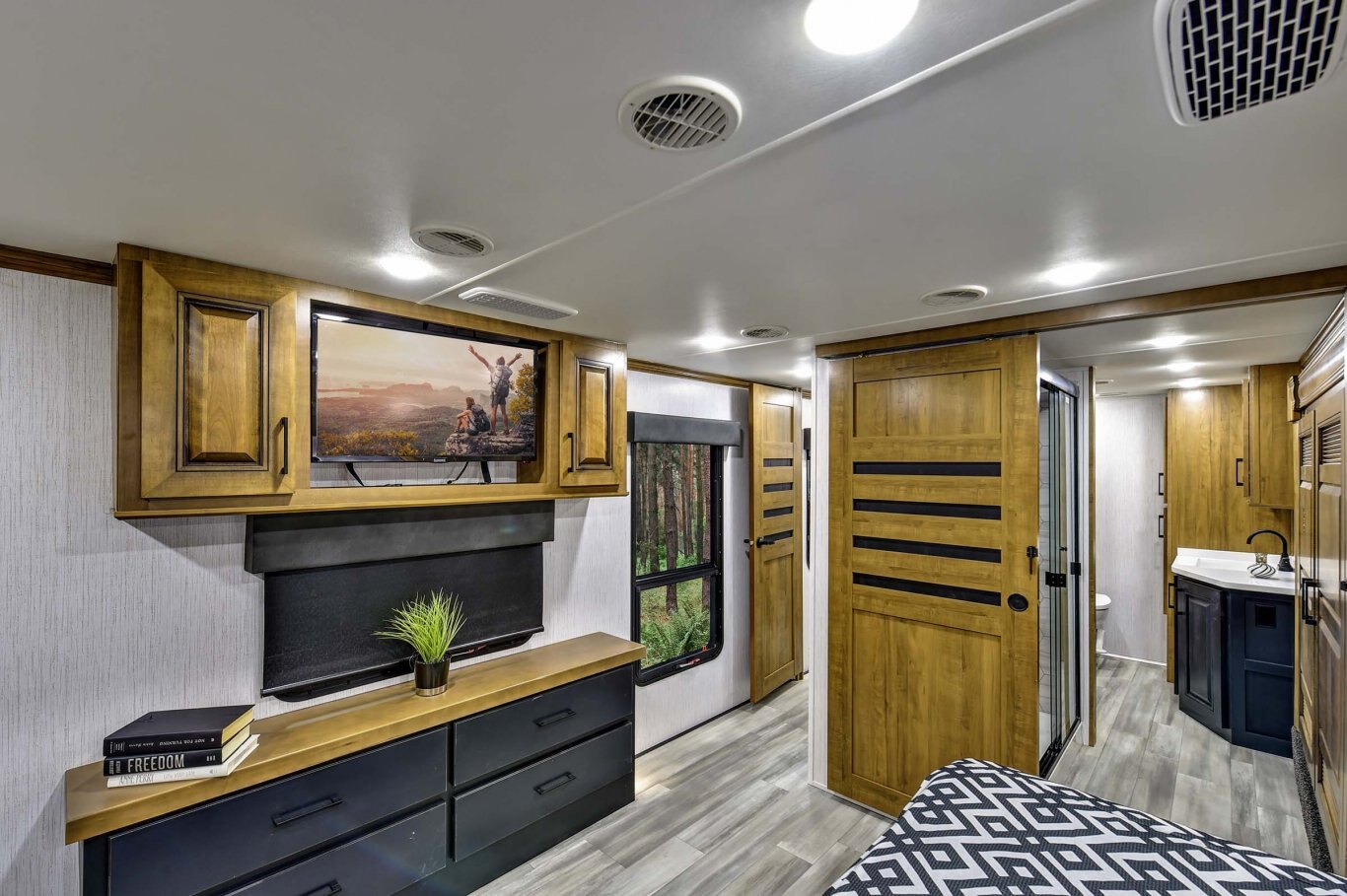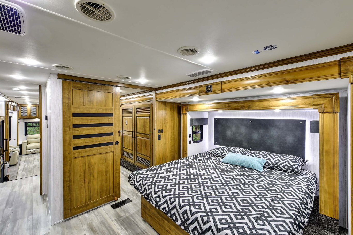 BEDROOM STANDARD FEATURES Standard king size bed Two windows in slide for better air flow 6´4˝ bedroom upper deck ceiling height Dual switched LED reading lights over bed Backlit headboard 32’’ LED bedroom television