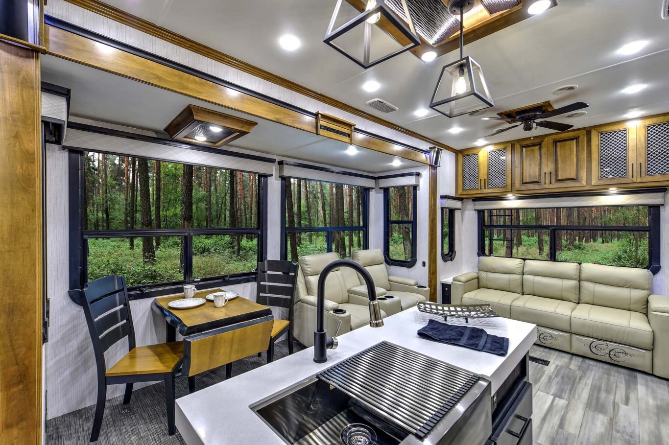 KITCHEN STANDARD FEATURES Amish -crafted 100% hardwood cabinetry, fascia and doors with hidden hinges and drawers 30˝ microwave oven over the range In-house milled and finished solid surface countertops throughout Residential size, stainless steel kitchen sink with matching solid surface sink covers Live edge dinette table with 2 standard and 2 folding chairs Single basin stainless steel kitchen sink with front apron