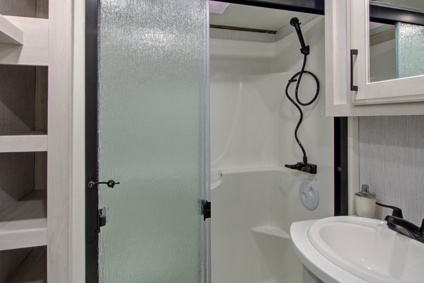 • One -piece fiberglass shower with glass door, towel bar and domed skylight