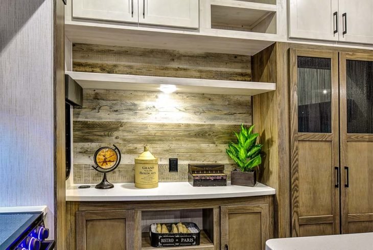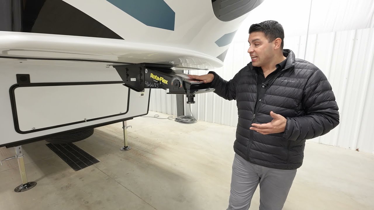 EXTERIOR FEATURES Anti-chucking Rota-flex 2″ pin box 50 Watt solar panel with inverter prep Upgraded MORryde solid step with quick adjust system at every door Level Up Electric System – Levels an RV using a one-touch auto leveling feature