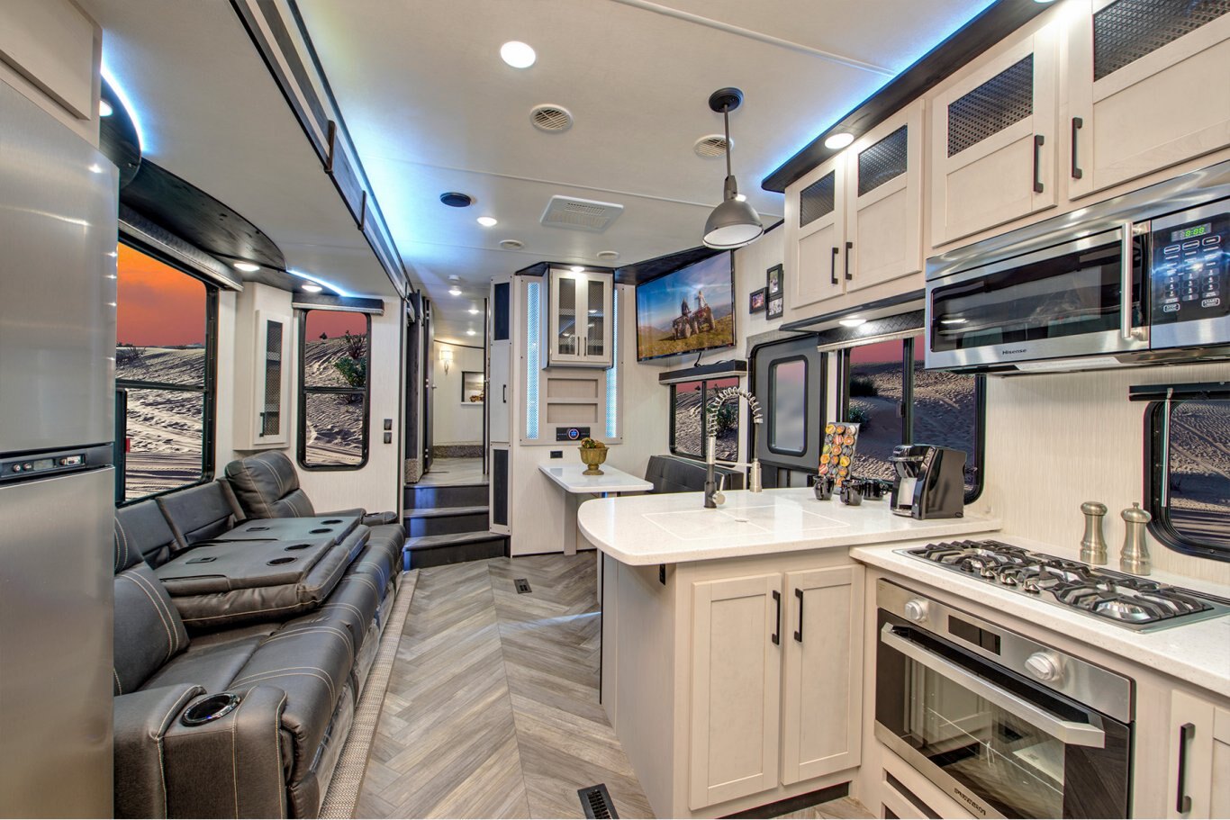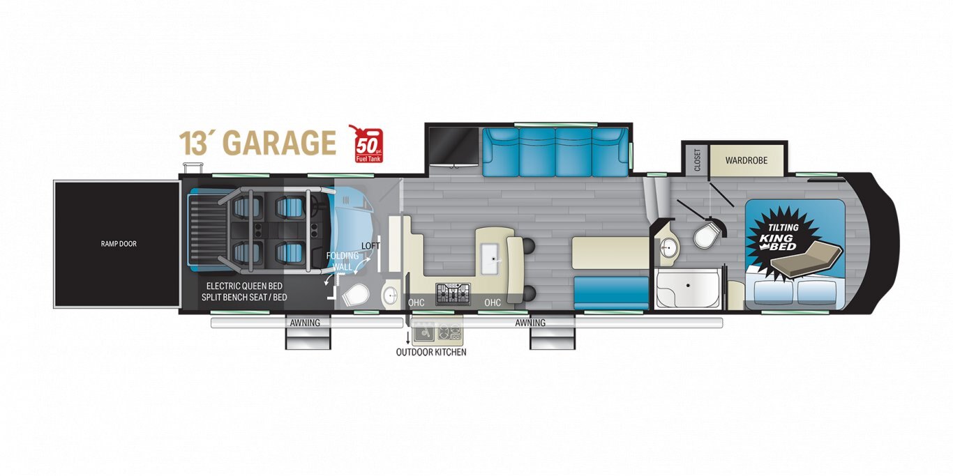 INTERIOR FEATURES Full Height Shaker Cabinetry with 25% more storage. Flush Floor bath deck with full ceiling height in bedroom. Culinary Kitchen workspace most countertop space in class along with residential microwave and massive 24” stand alone oven. Tilting King Bedroom Suite with 30% more bedroom floor space with walk -in closet. Industry’s largest freshwater tanks. Dry Camp longer with 150 gallons. LED lighting throughout Roller shades in living area Solid surface sink covers Fireplace Custom monitor control panel Custom One Touch Monitor Panel (3)15,000 BTU A/C Overhead cabinets or shelving throughout High quality overstuffed residential furniture Capet Free Slide Outs 50″ LCD HDTV with cable/satellite hook-ups Three zone JBL Audio System & Two JBL exterior marine grade speakers