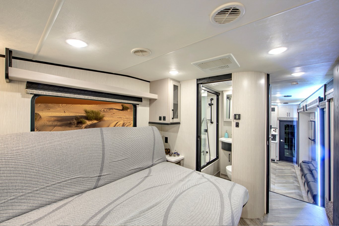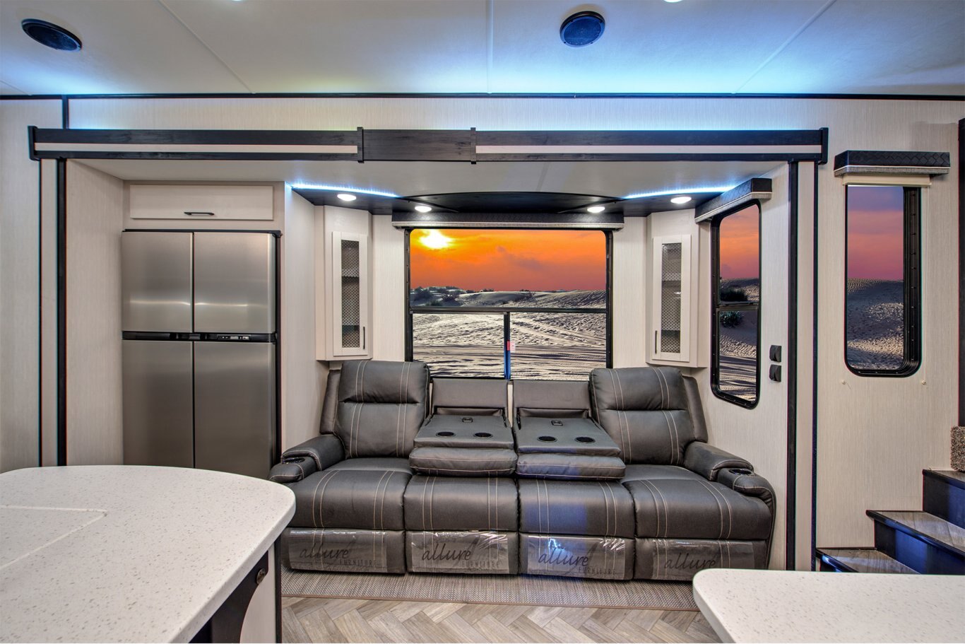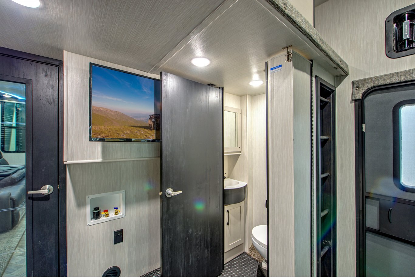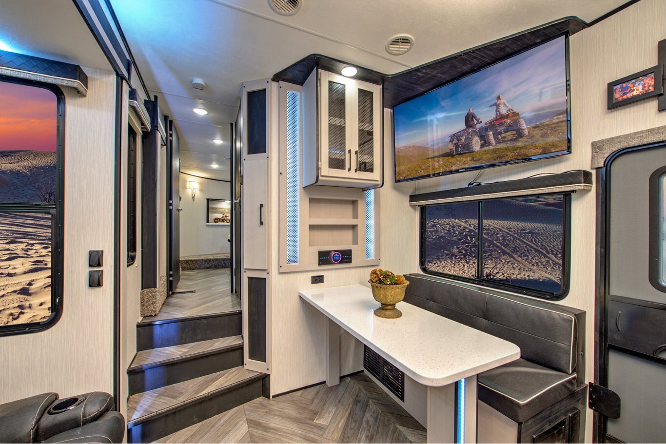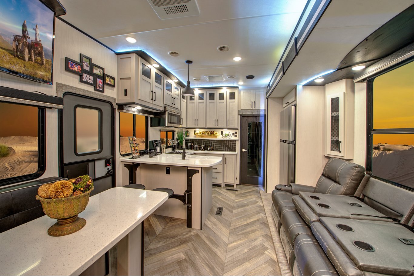 Take the world by storm. This fifth wheel gives you toy hauler capacity with indulgent features. Our King bedroom suites include a “swift space” pull out dresser workstation and the Store-More three-sided access to the basement provides 30% more storage. Satisfy your wanderlust without sacrificing anything.