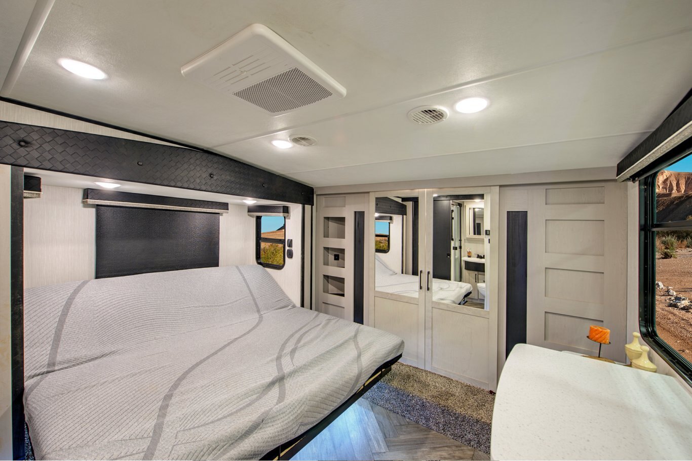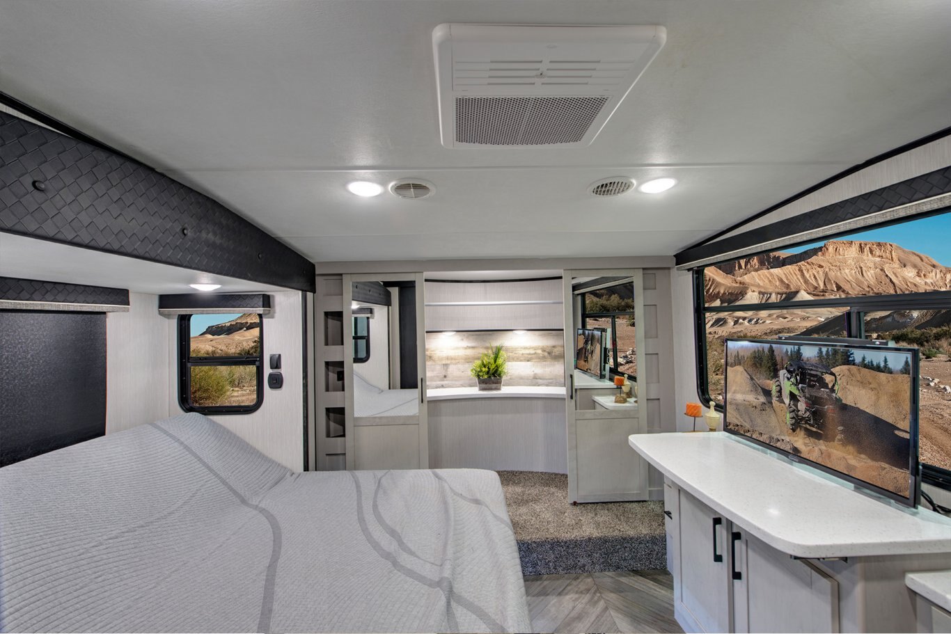 Take the world by storm. This fifth wheel gives you toy hauler capacity with indulgent features. Our King bedroom suites include a “swift space” pull out dresser workstation and the Store-More three-sided access to the basement provides 30% more storage. Satisfy your wanderlust without sacrificing anything.