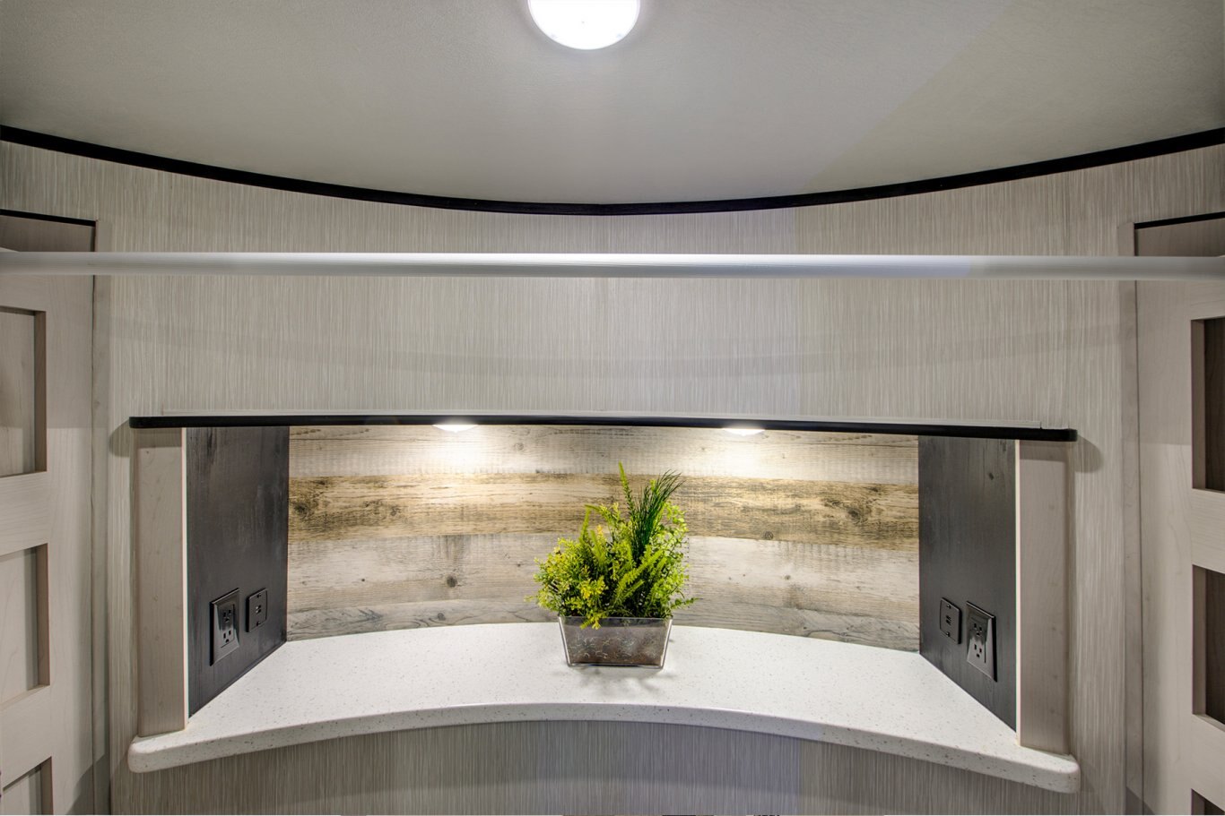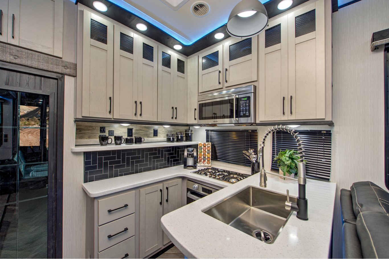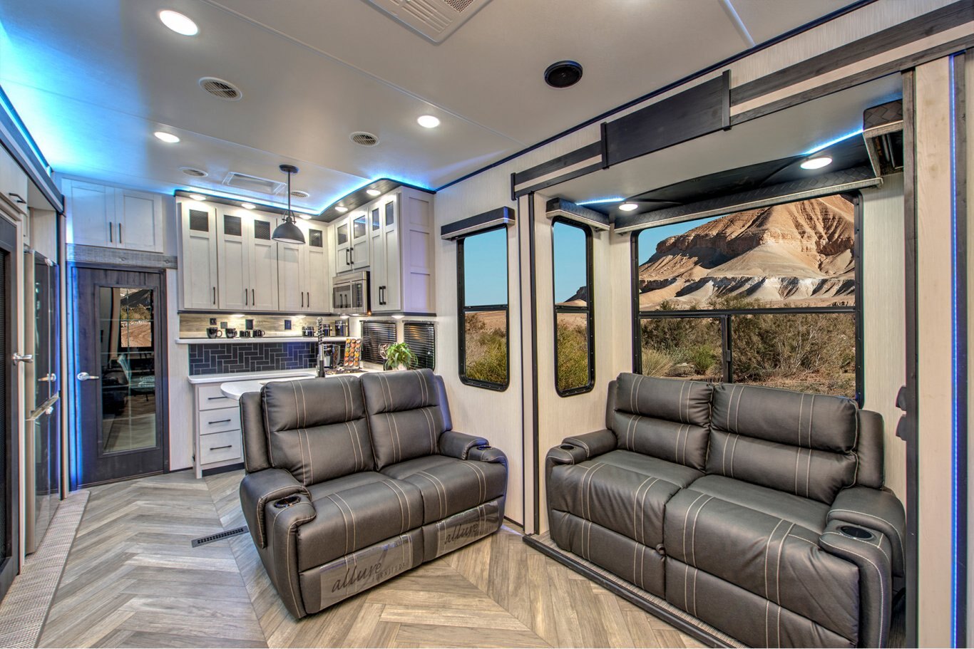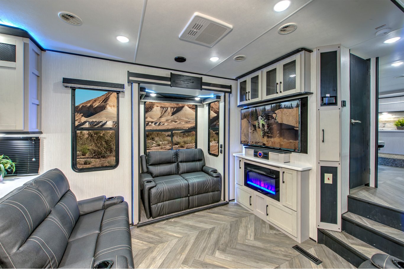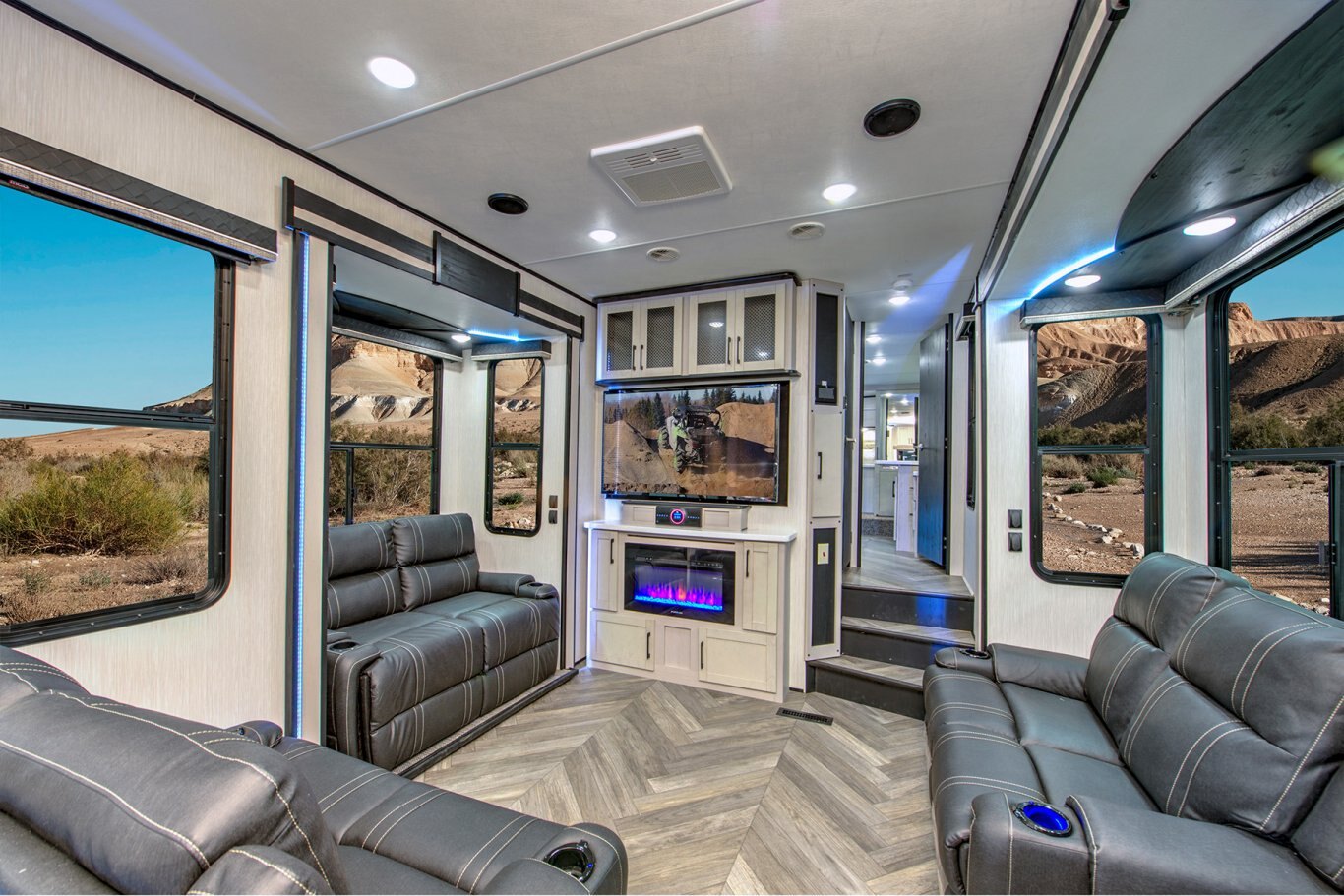 INTERIOR FEATURES Full Height Shaker Cabinetry with 25% more storage. Flush Floor bath deck with full ceiling height in bedroom. Culinary Kitchen workspace most countertop space in class along with residential microwave and massive 24” stand alone oven. Tilting King Bedroom Suite with 30% more bedroom floor space with walk -in closet. Industry’s largest freshwater tanks. Dry Camp longer with 150 gallons. LED lighting throughout Roller shades in living area Solid surface sink covers Fireplace Custom monitor control panel Custom One Touch Monitor Panel (3)15,000 BTU A/C Overhead cabinets or shelving throughout High quality overstuffed residential furniture Capet Free Slide Outs 50″ LCD HDTV with cable/satellite hook-ups Three zone JBL Audio System & Two JBL exterior marine grade speakers