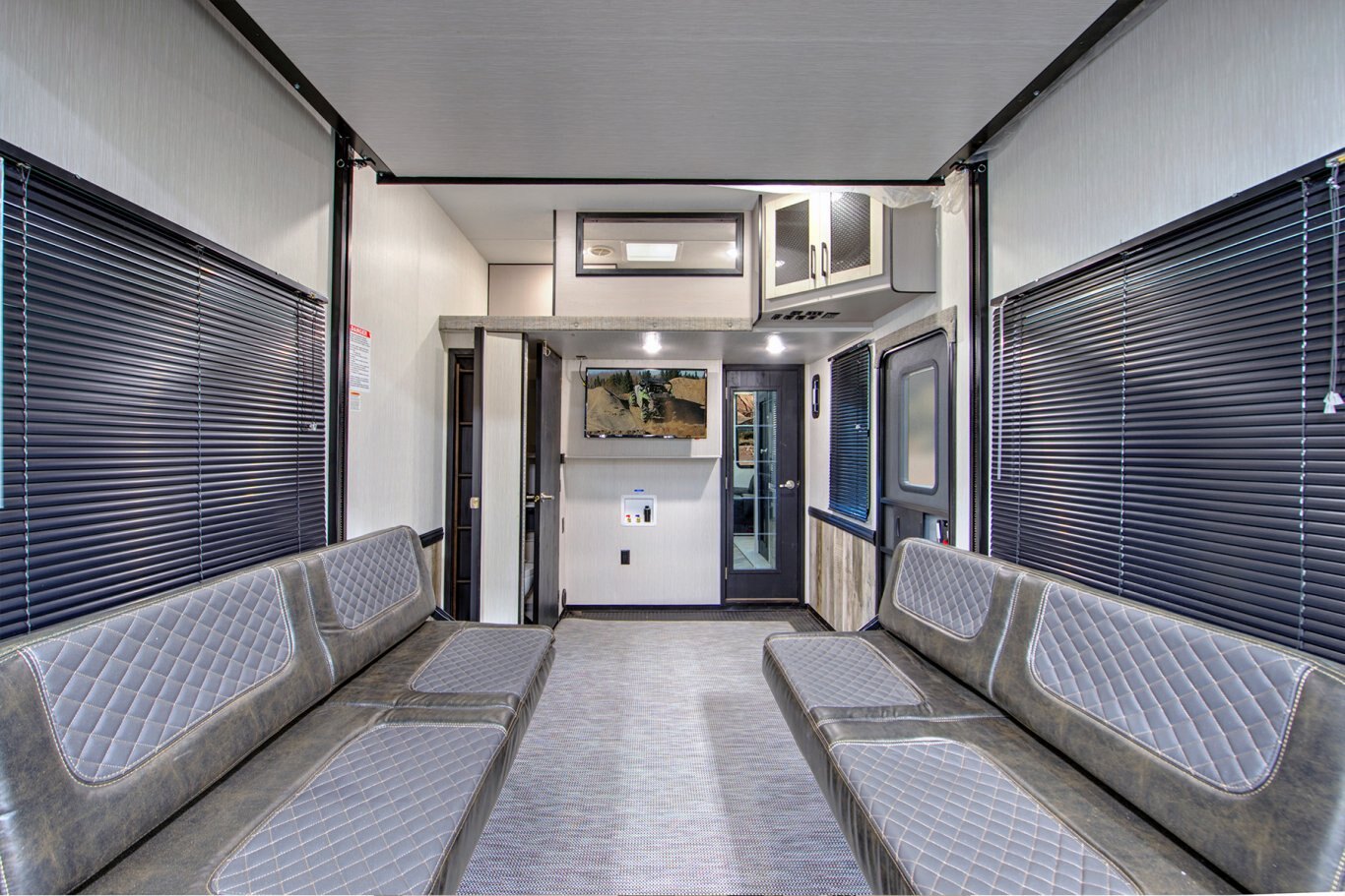 GARAGE STANDARD FEATURES Plywood garage flooring Steel D-ring tie downs 3000 lb. rated weather resistant ramp door Large 8’ garage door ramp Heat duct in garage Rear screen Oversized windows max ventilation Decorative chair rail Built-in overhead cabinets with entertainment center Power Queen beds with convertible sofa Heat strip in the garage A/C