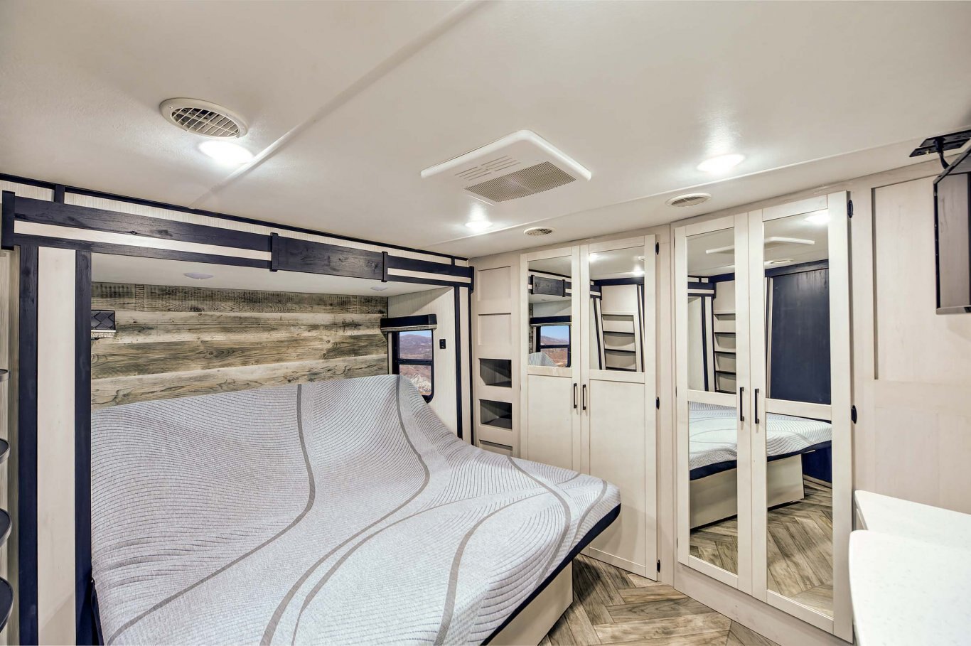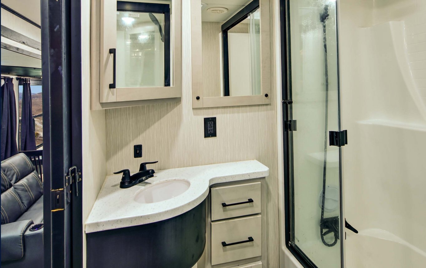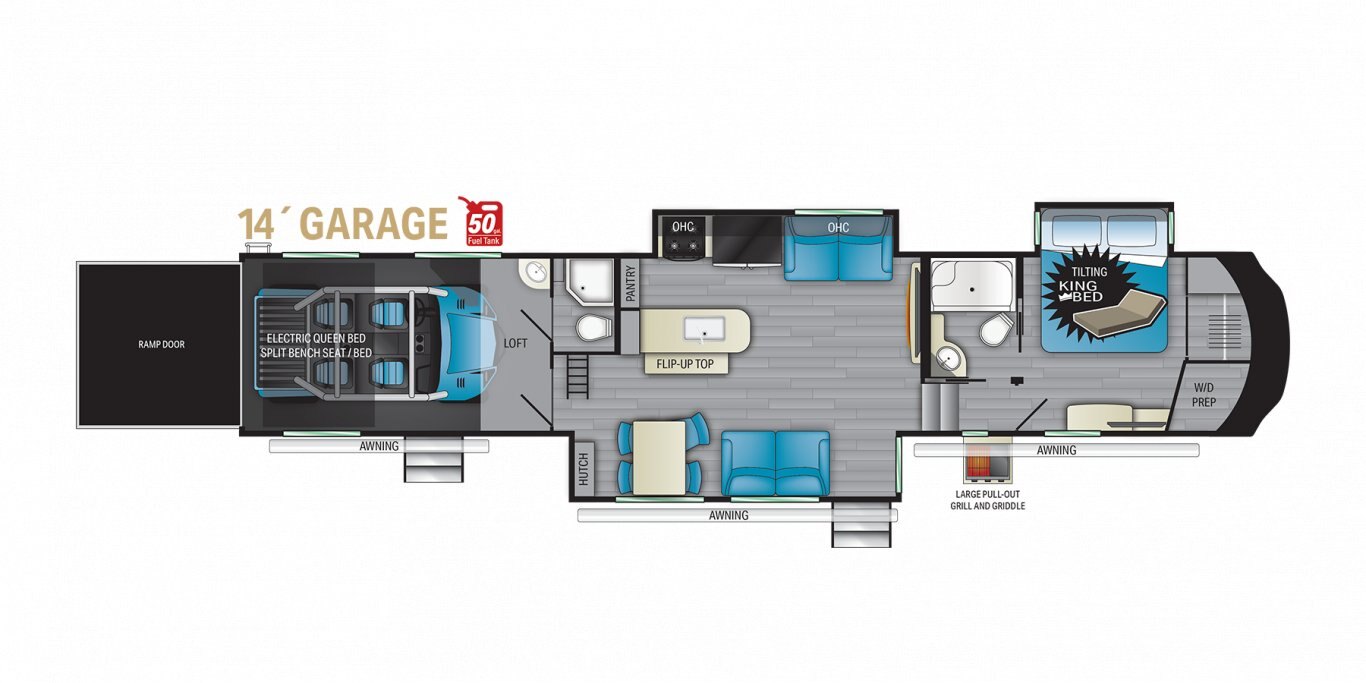 Take the world by storm. This fifth wheel gives you toy hauler capacity with indulgent features. Our King bedroom suites include a “swift space” pull out dresser workstation and the Store-More three-sided access to the basement provides 30% more storage. Satisfy your wanderlust without sacrificing anything.