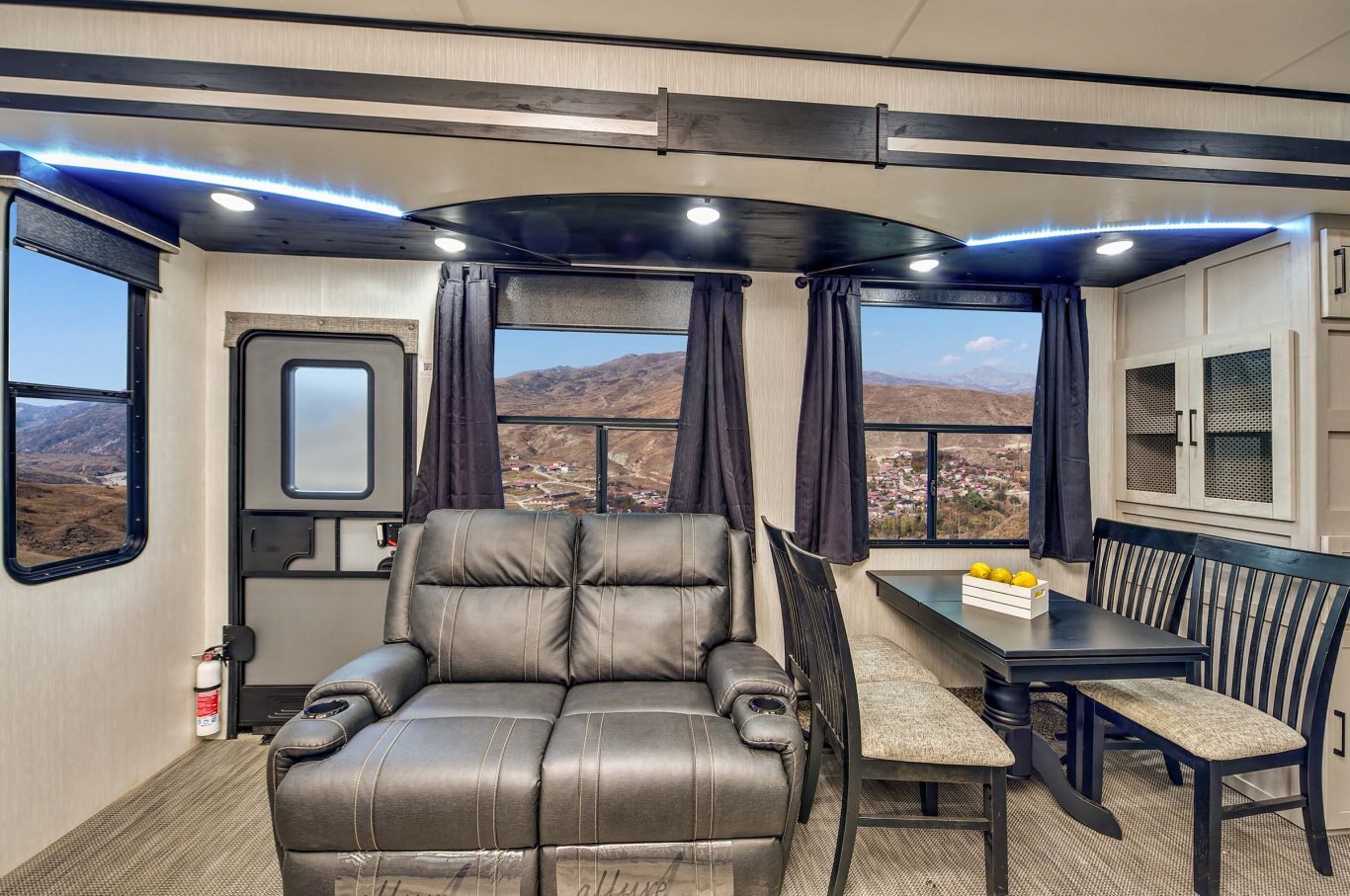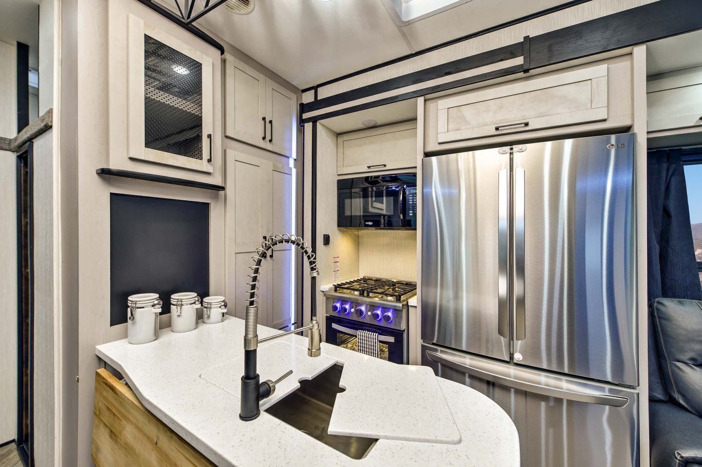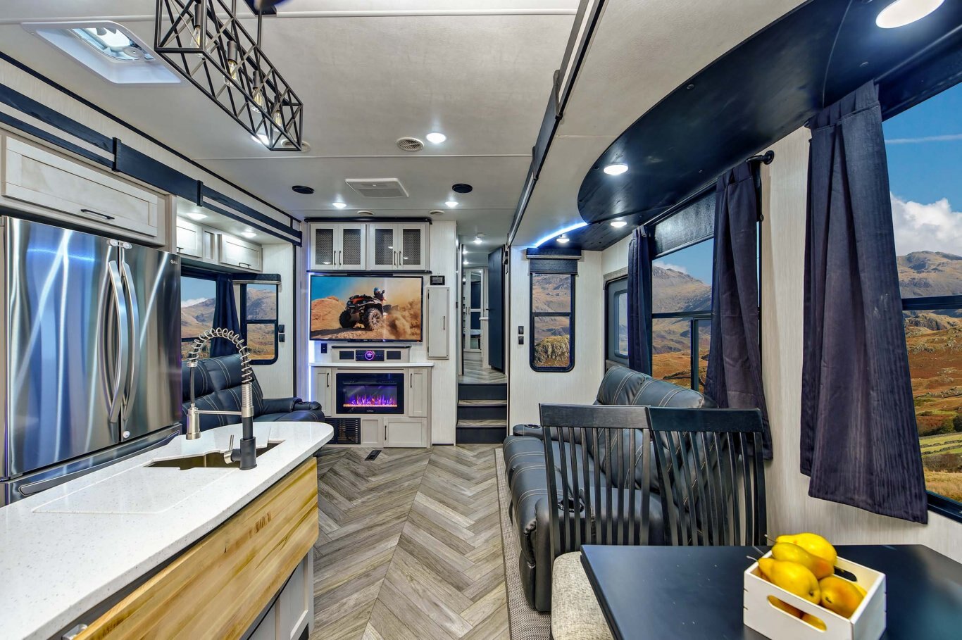 INTERIOR FEATURES Full Height Shaker Cabinetry with 25% more storage. Flush Floor bath deck with full ceiling height in bedroom. Culinary Kitchen workspace most countertop space in class along with residential microwave and massive 24” stand alone oven. Tilting King Bedroom Suite with 30% more bedroom floor space with walk -in closet. Industry’s largest freshwater tanks. Dry Camp longer with 150 gallons. LED lighting throughout Roller shades in living area Solid surface sink covers Fireplace Custom monitor control panel Custom One Touch Monitor Panel (3)15,000 BTU A/C Overhead cabinets or shelving throughout High quality overstuffed residential furniture Capet Free Slide Outs 50″ LCD HDTV with cable/satellite hook-ups Three zone JBL Audio System & Two JBL exterior marine grade speakers