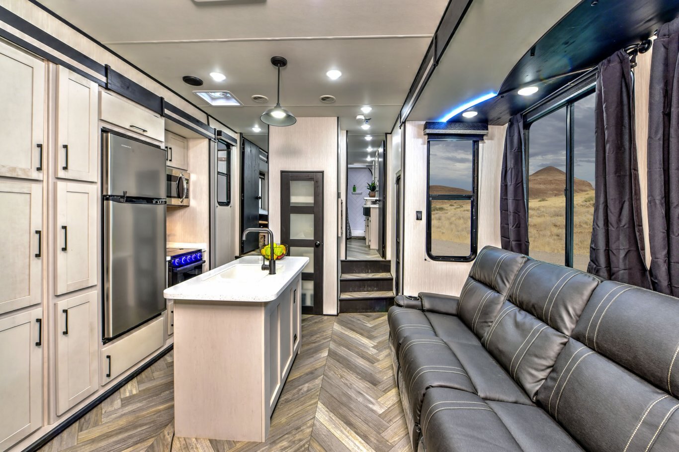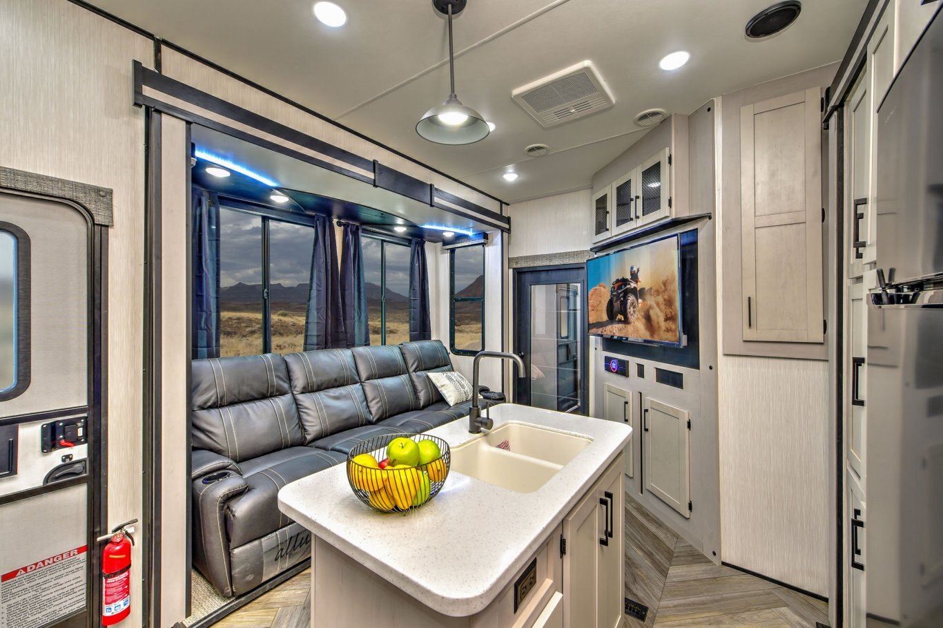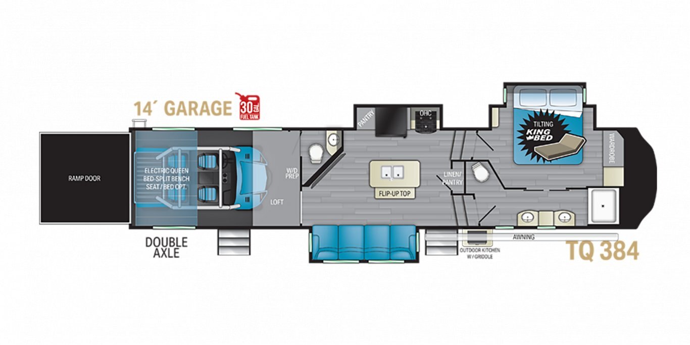 Check your next adventure off your bucket list with the capability of a fifth wheel and the versatility of a toy hauler. Revel in the ultimate interior living space with high-end residential touches like our all-new east/west tilting king bedroom suites. And feel the call of the wild knowing that your cargo possibilities are endless — and your toys are conveniently stashed on board.