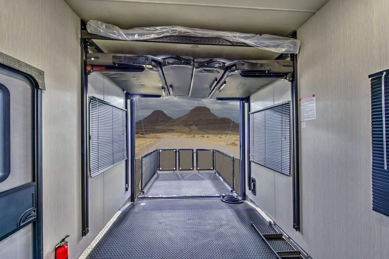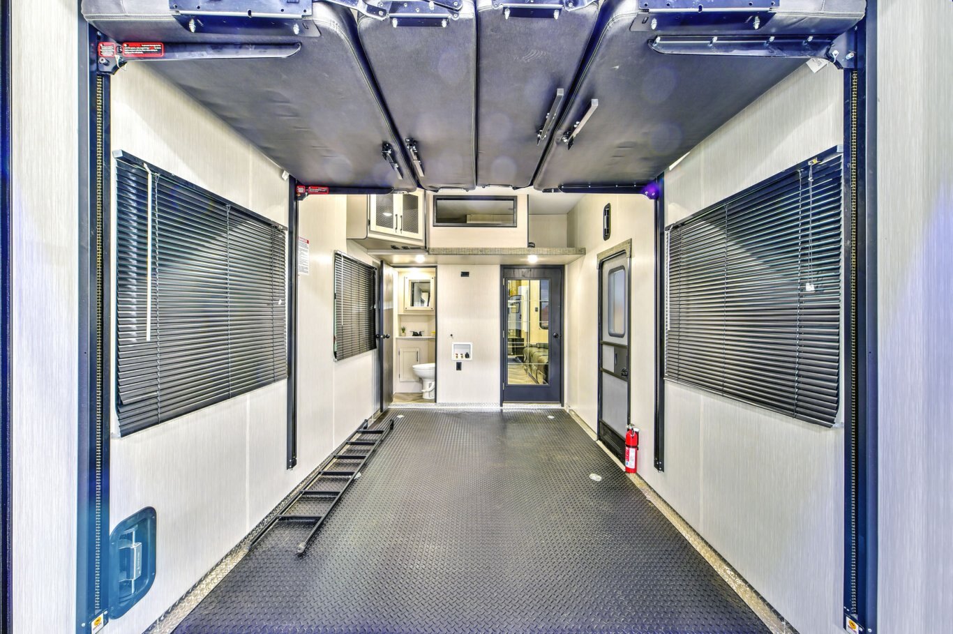GARAGE STANDARD FEATURES Fuel and oil resistant diamond plate TPO rubberized flooring 3000 lb weather resistant ramp door High efficiency 12V fan Heat and A/C Folding 1/2 bath walls ( 371,373) Four step garage entry Rear electric Queen bed with convertible sofa Rear screen