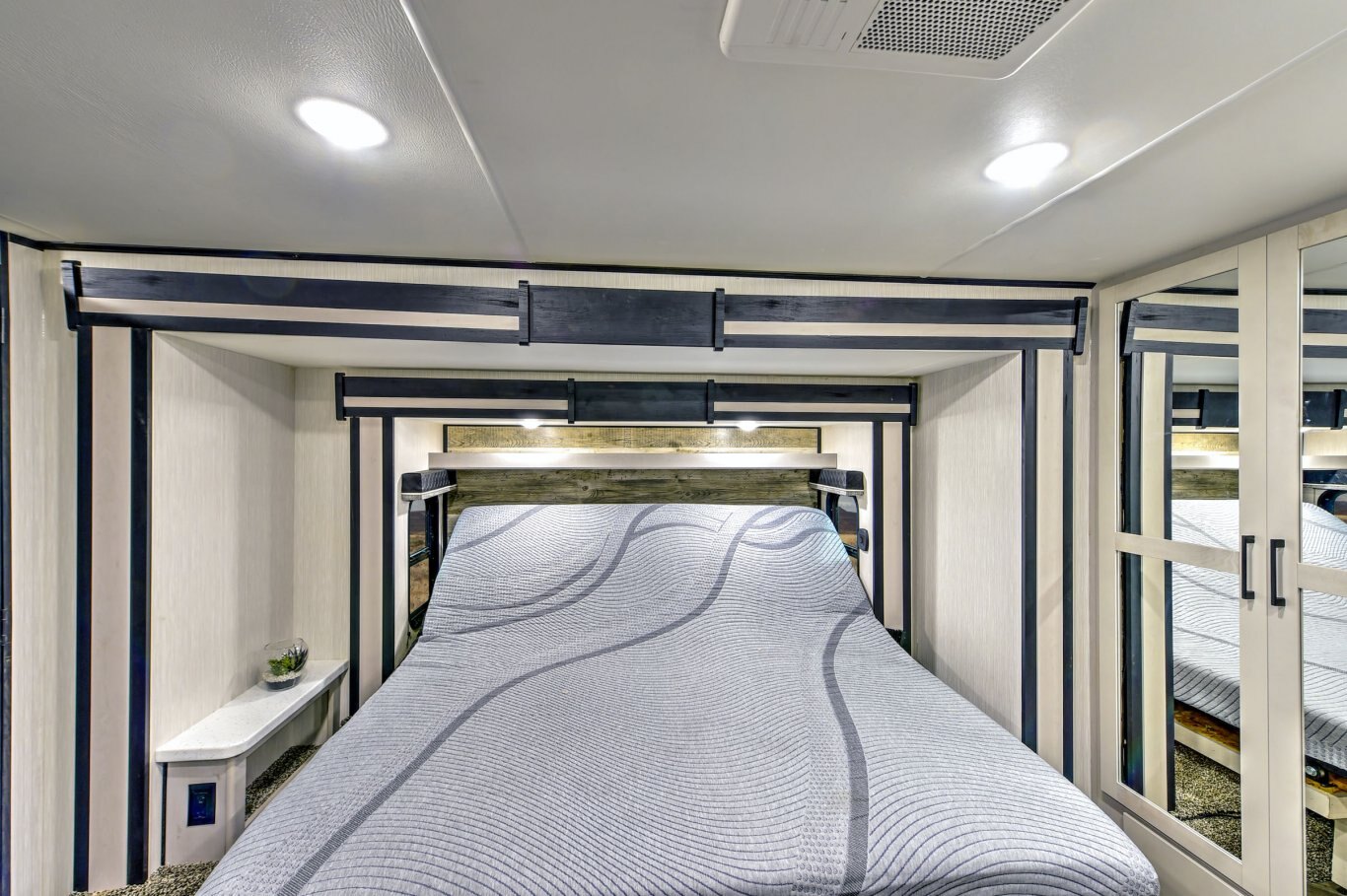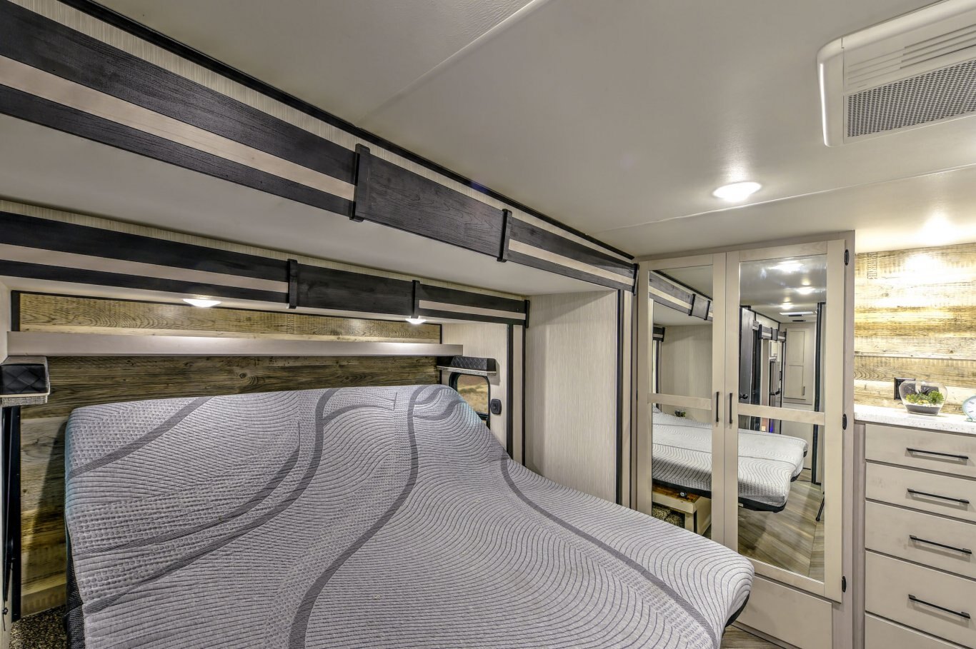 BEDROOM FEATURES Single level master suite Bedroom TV hookup with booster Overhead reading lights Tilting King bedroom suite with 30% more floor space Swift space work station