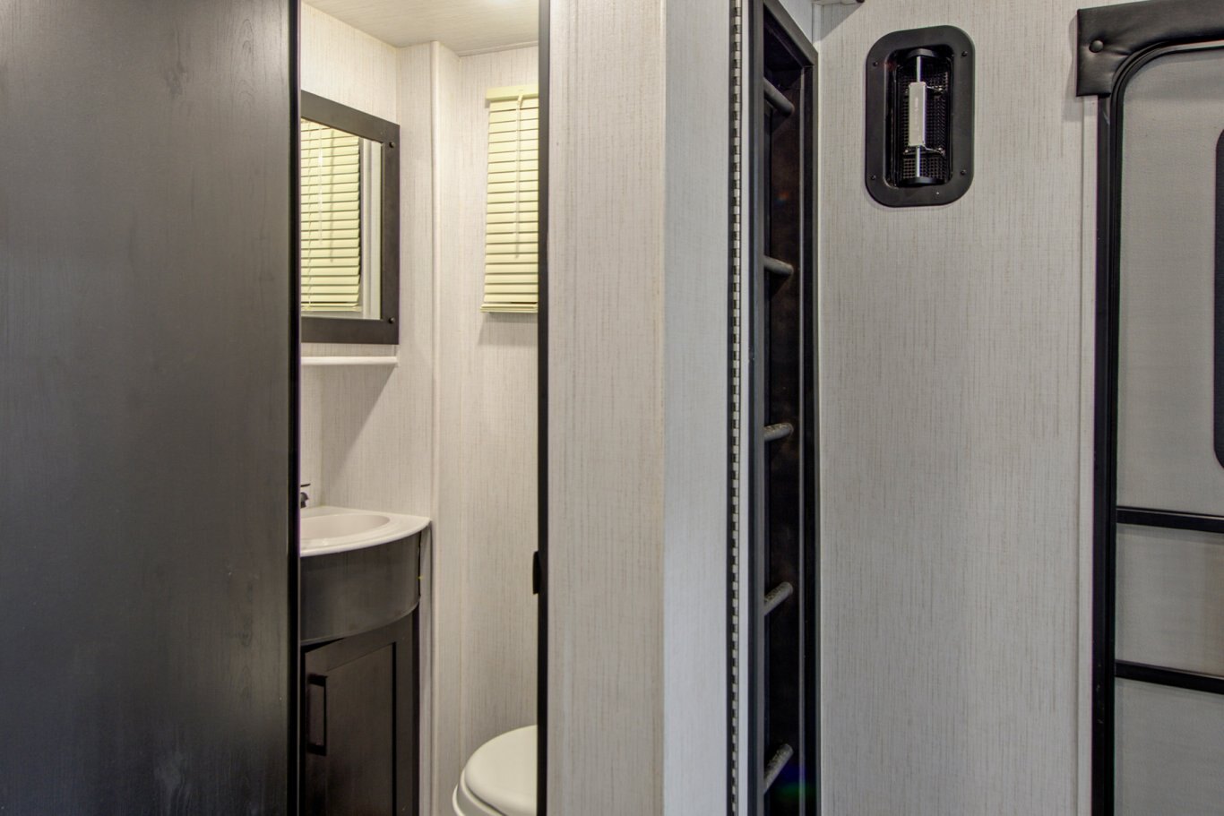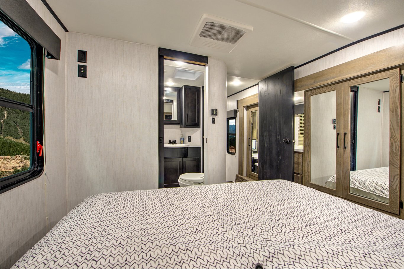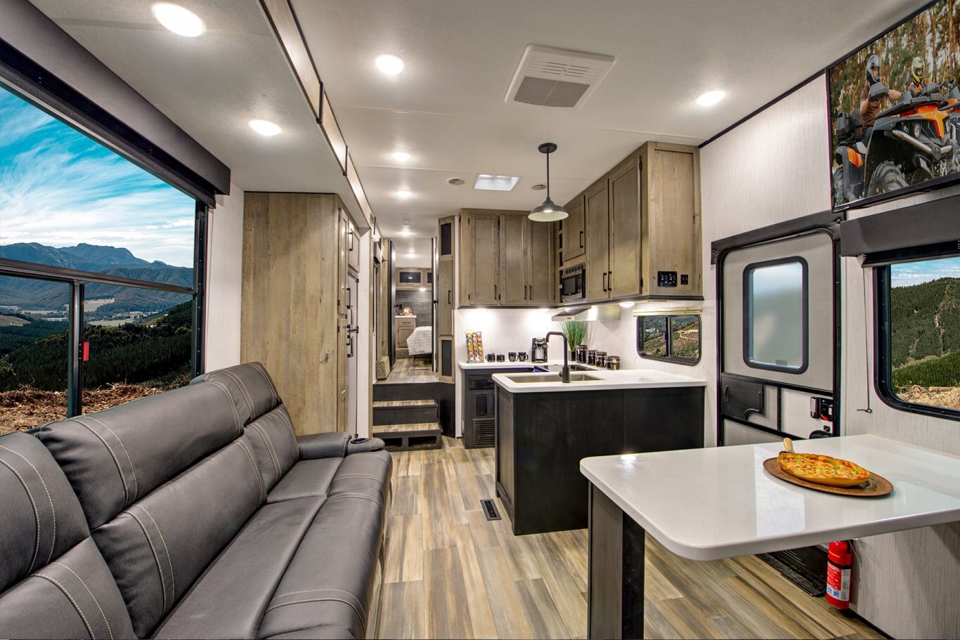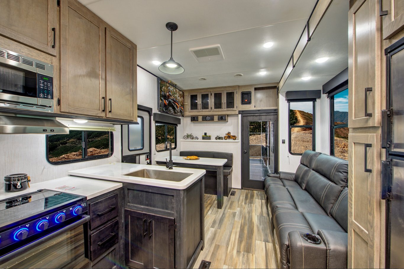 Fuel your RV passion with this fifth wheel designed to treat you and your toys right. From the king bed that comes standard, to exceptional storage space, to the spacious full garage with frame welded tie downs, this value-packed toy hauler makes it more fun than ever to get outside and play.