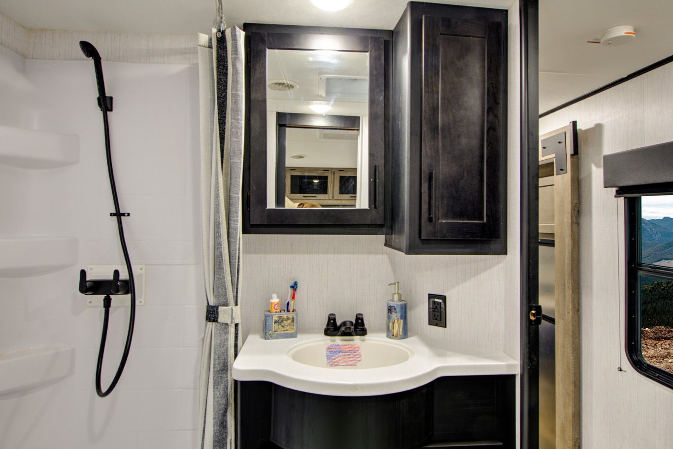 EXTERIOR FEATURES MORryde Step Above® exterior steps 6-Point electric automatic leveling system Universal docking station with black tank flush 100 Watt solar panel with inverter prep Azdel Sidewalls LED Stop/Turn/Taillights Dual 30# LP Tanks Exterior Speakers Back-up Camera Prep Power Awning with LED Light Fuel Station with Generator Prep Black Tank Flush