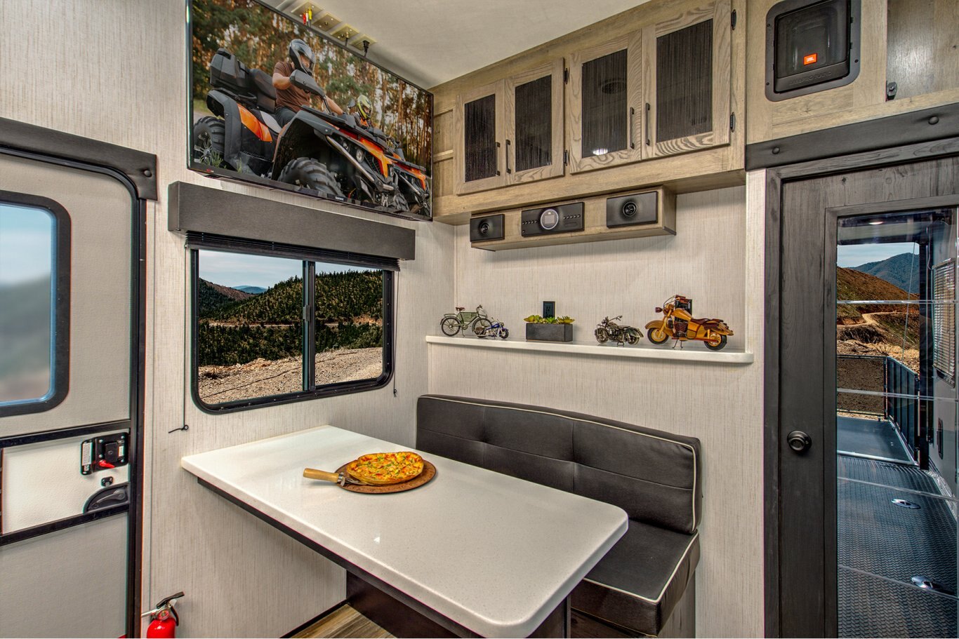 INTERIOR FEATURES Power drop down queen bed / opposing sofa / dinette in garage Spacious full garage with frame welded tie downs Reclining sofa seating with fold down center console featuring cup holders 50˝ living room tv with JBL® HiFi speakers and subwoofer Solid Stained Hardwood Doors and Drawers with Full Extension Drawer Guides Cold Crack Resistant Floor Cable TV & Satellite prep DMI/USB/AM/FM Stereo Entertainment System Cloth Style Night Shades Reclining Sofa Seating