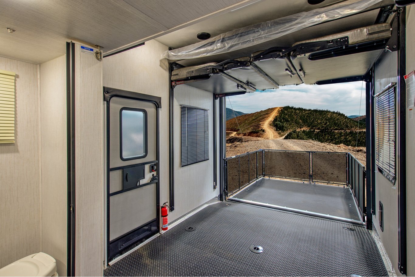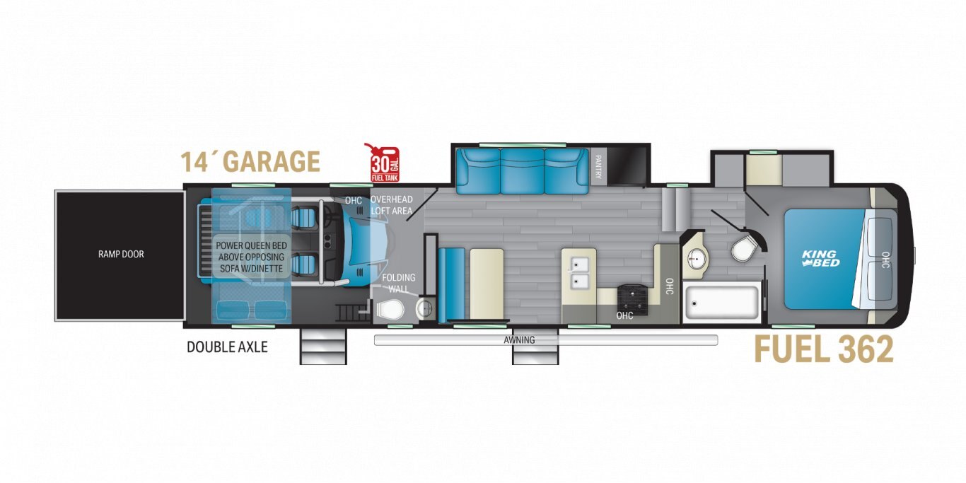 FUEL XTREME PACKAGE (FORCED) Wide Body Construction High Gloss Aluminum Framed & Laminated Sidewalls Tinted Safety Glass Windows Aluminum Rims Spare Tire Dexter 7000# Axles Power Front Landing Gear Power Rear Stabilizers Universal Docking Station w/Black Tank Flush Heated and Enclosed Underbelly LED Stop/Turn/Tail Lights, Twin 30# LP Tanks, Exterior Speakers Back-up Camera Prep Power Awning w/LED Light Solar Prep Triple Entry Garage Steps Fuel Station w/Generator Prep Rear Ramp Door
