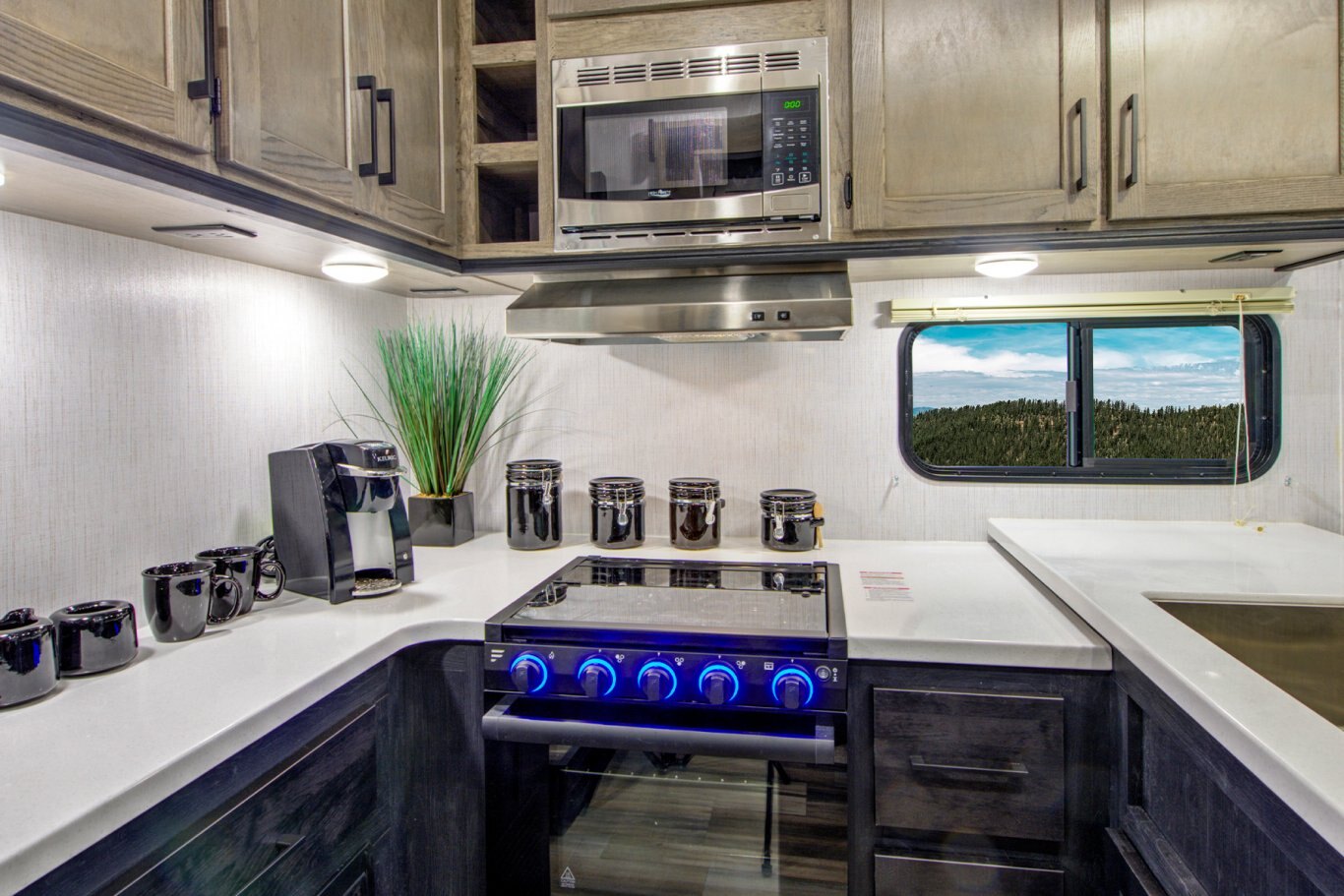 EXTERIOR FEATURES MORryde Step Above® exterior steps 6-Point electric automatic leveling system Universal docking station with black tank flush 100 Watt solar panel with inverter prep Azdel Sidewalls LED Stop/Turn/Taillights Dual 30# LP Tanks Exterior Speakers Back-up Camera Prep Power Awning with LED Light Fuel Station with Generator Prep Black Tank Flush