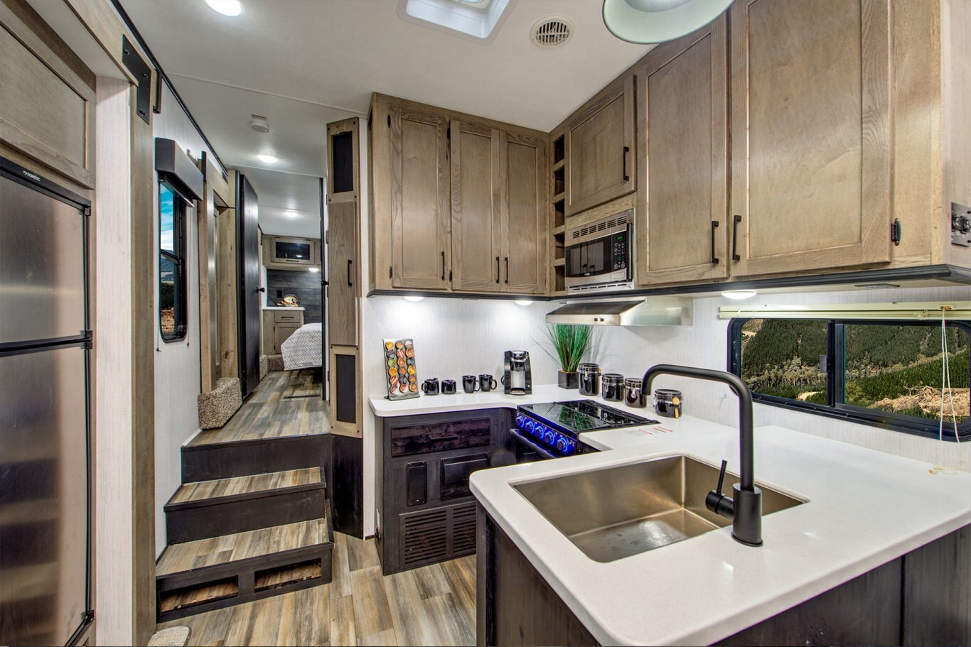 FUEL PACKAGE (FORCED) Solid Stained Hardwood Doors and Drawers LED Interior Lighting Drawers w/Full Extension Drawer Guides Stainless Steel Kitchen Sink w/Residential Style Faucet Microwave, 8cu. Stainless Steel Refrigerator 15K BTU Ducted A/C System 2nd A/C Prep 8 Gal DSI 110/12V Water Heater w/Bypass, Large Shower w/Skylight, Toilet w/ Foot Flush King Bed Cold Crack Resistant floor Cable TV & Satellite prep DVD/CD/Radio Entertainment package Pleated Night Shades Quad Aluminum Entry Steps