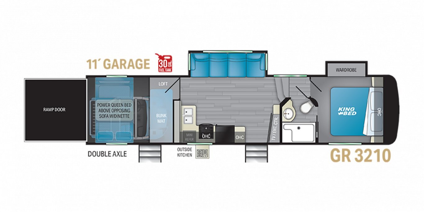 INTERIOR FEATURES JBL Hi-Fi sound system with subwoofer Frame Welded Garage Tie Downs – tie downs professionally welded to the frame for securing heavy toys Solid surface countertops King bed in ALL floor Plans Wireless charging ports