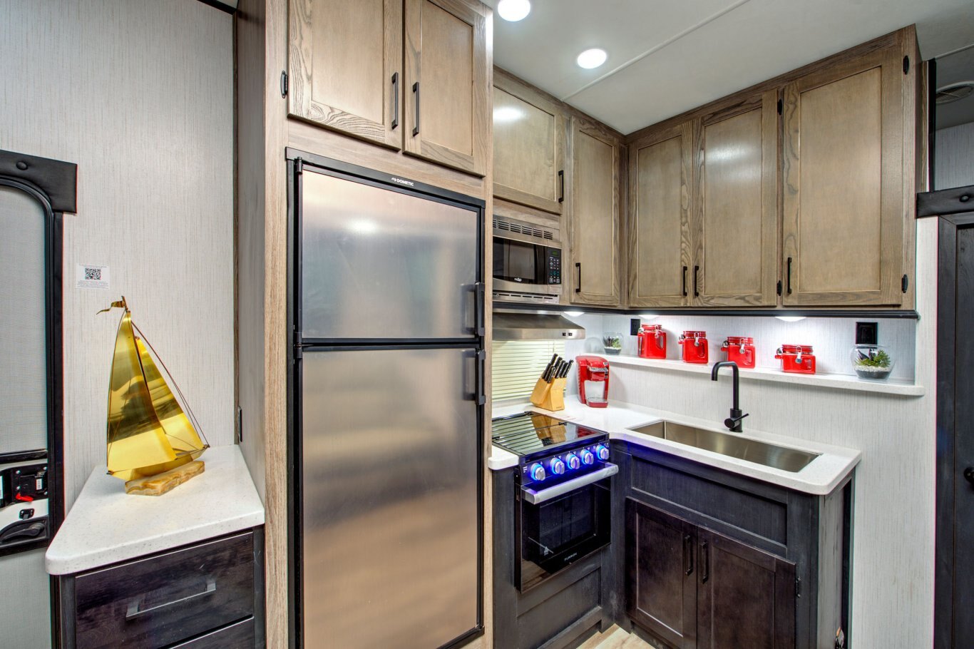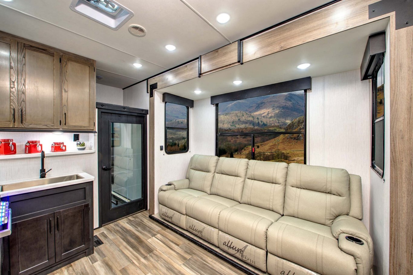 MISSION PACKAGE Solid Stained Hardwood Doors & Drawers LED Interior Lighting Drawers with Full Extension Drawer Guides Stainless Steel Kitchen Sink with Residential Style Faucet Microwave 8 Cu. Stainless Steel Refrigerator 2 x 13.5k BTU A/C System 8 Gal DSI 110/12V Water Heater with Bypass Large Shower w/Skylight Toilet with foot Flush King Bed Cold Crack Resistant Floor Cable TV & Satellite Prep DVD/CD/Radio Entertainment Package Pleated Night Shades Quad Aluminum Entry Steps Power Bed with Convertible Sofa Reclining Sofa Seating with Fold Down Counsel Featuring Cup Holders & USB