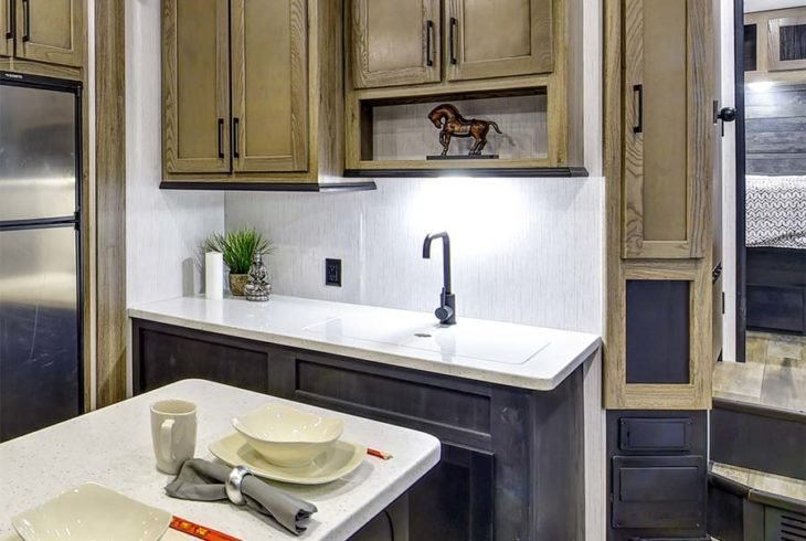 MISSION PACKAGE Solid Stained Hardwood Doors & Drawers LED Interior Lighting Drawers with Full Extension Drawer Guides Stainless Steel Kitchen Sink with Residential Style Faucet Microwave 8 Cu. Stainless Steel Refrigerator 2 x 13.5k BTU A/C System 8 Gal DSI 110/12V Water Heater with Bypass Large Shower w/Skylight Toilet with foot Flush King Bed Cold Crack Resistant Floor Cable TV & Satellite Prep DVD/CD/Radio Entertainment Package Pleated Night Shades Quad Aluminum Entry Steps Power Bed with Convertible Sofa Reclining Sofa Seating with Fold Down Counsel Featuring Cup Holders & USB