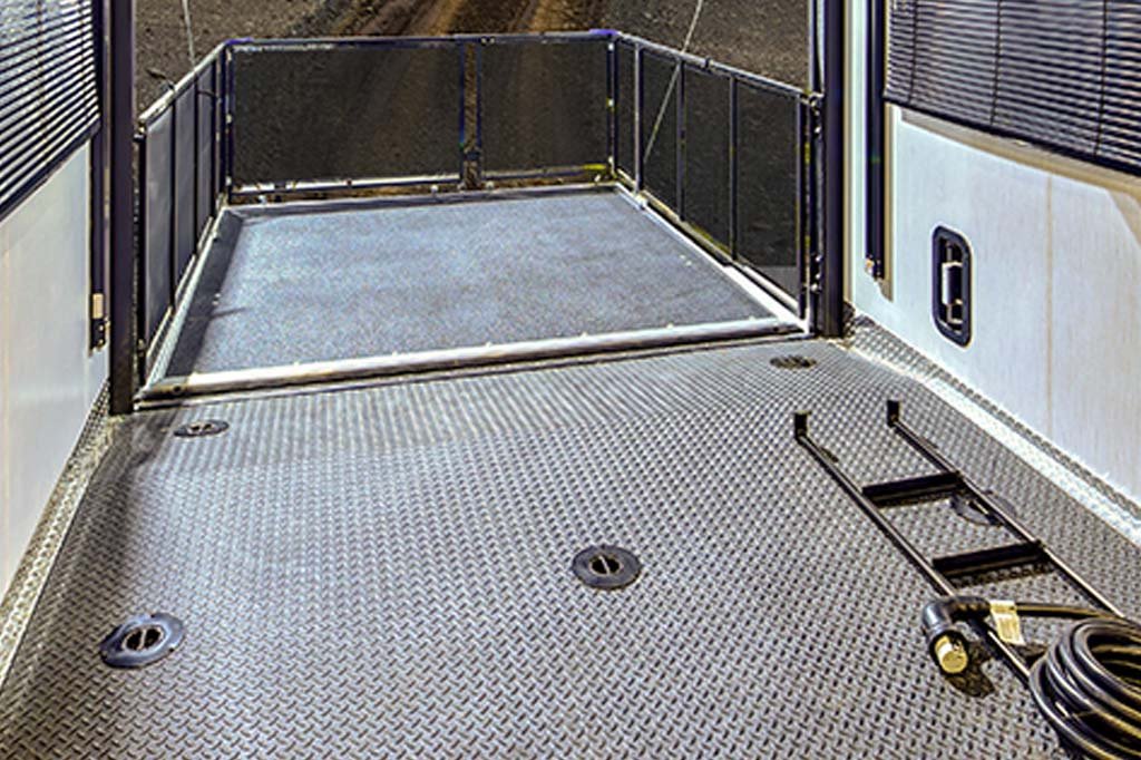 INTERIOR FEATURES JBL Hi-Fi sound system with subwoofer Frame Welded Garage Tie Downs – tie downs professionally welded to the frame for securing heavy toys Solid surface countertops King bed in ALL floor Plans Wireless charging ports
