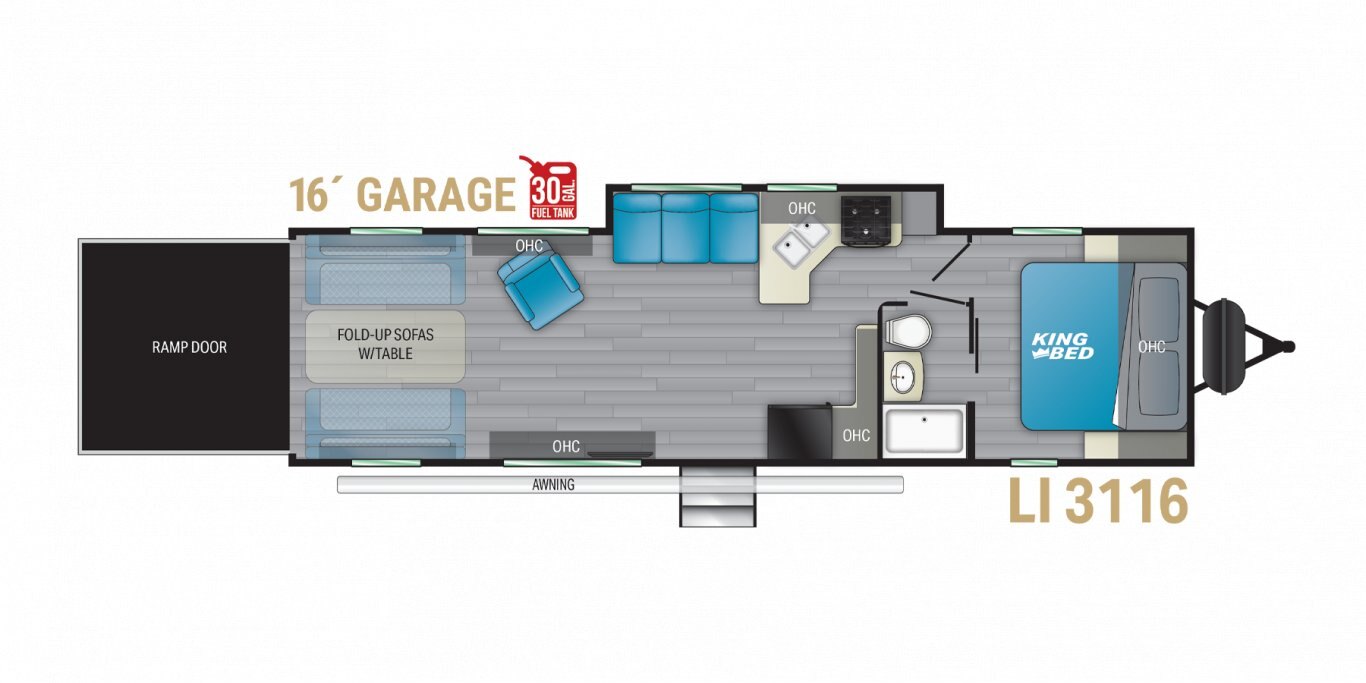 INTERIOR FEATURES King size walk around beds on every floor plan Secure tie downs in the garage featuring more than any other brand Durable Diamond garage floor and entry providing one of the most durable flooring for driving in toys 8’ceiling to fit all your toys 10.7 cu refrigerator / 12 Volt with doodle station