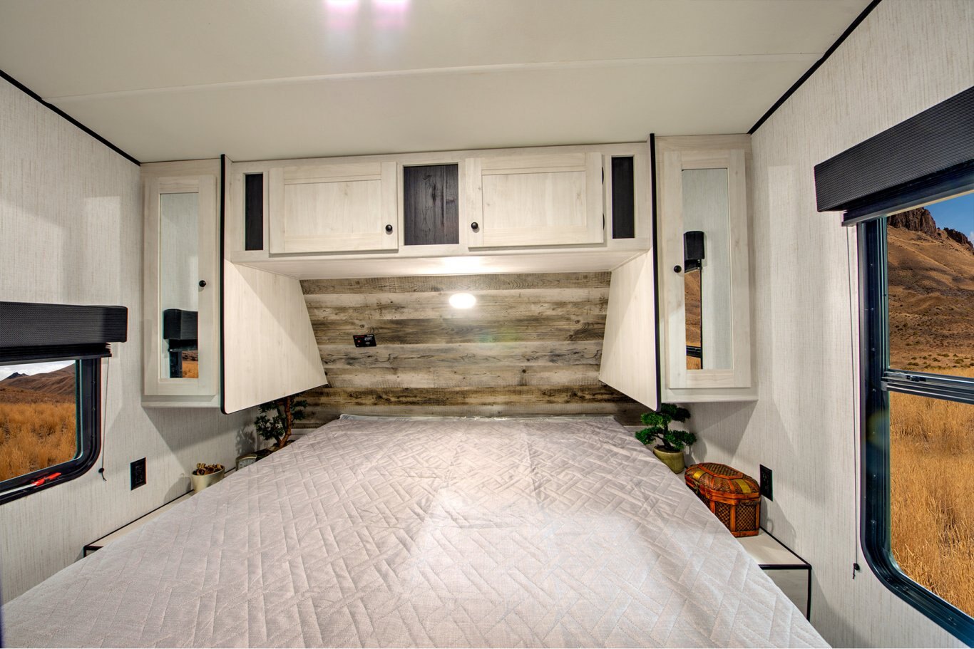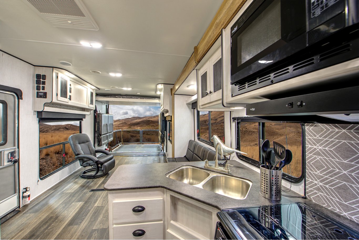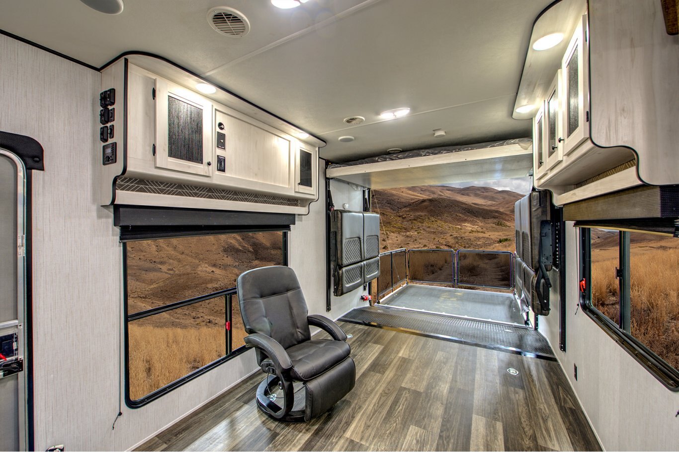 Supercharge your next family vacation. With a spacious interior and ample storage, you don’t have to choose which of your outdoor toys to take with you. Exceptional amenities like king size walk around beds, an exclusive convection microwave, and a wide body (102 inches) that easily fits stock side-by-sides help power any adventure.