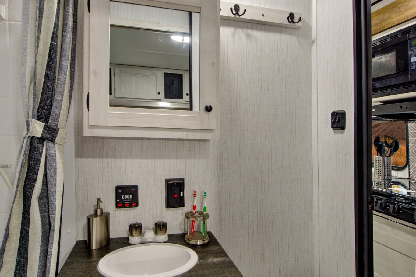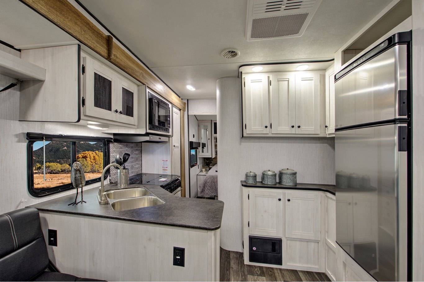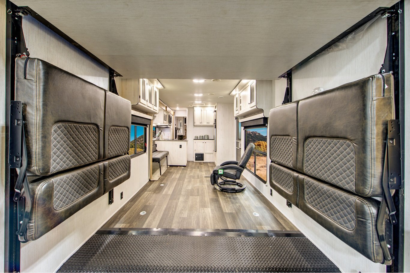 Supercharge your next family vacation. With a spacious interior and ample storage, you don’t have to choose which of your outdoor toys to take with you. Exceptional amenities like king size walk around beds, an exclusive convection microwave, and a wide body (102 inches) that easily fits stock side-by-sides help power any adventure.