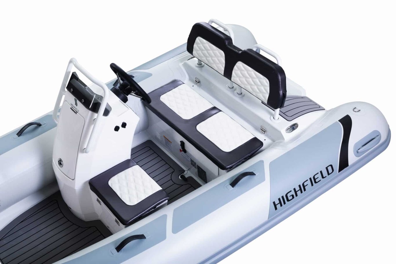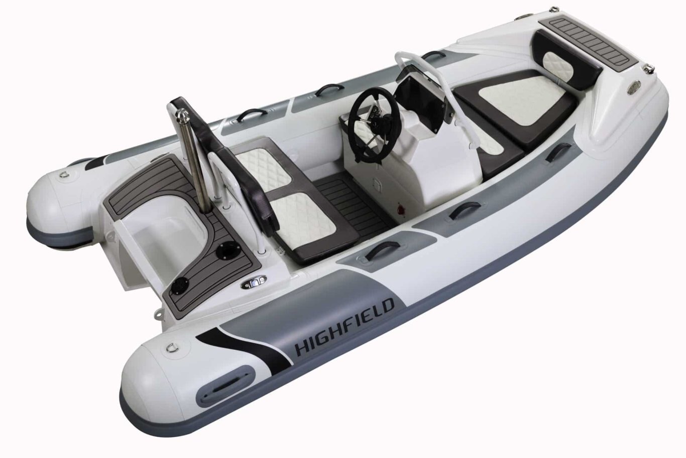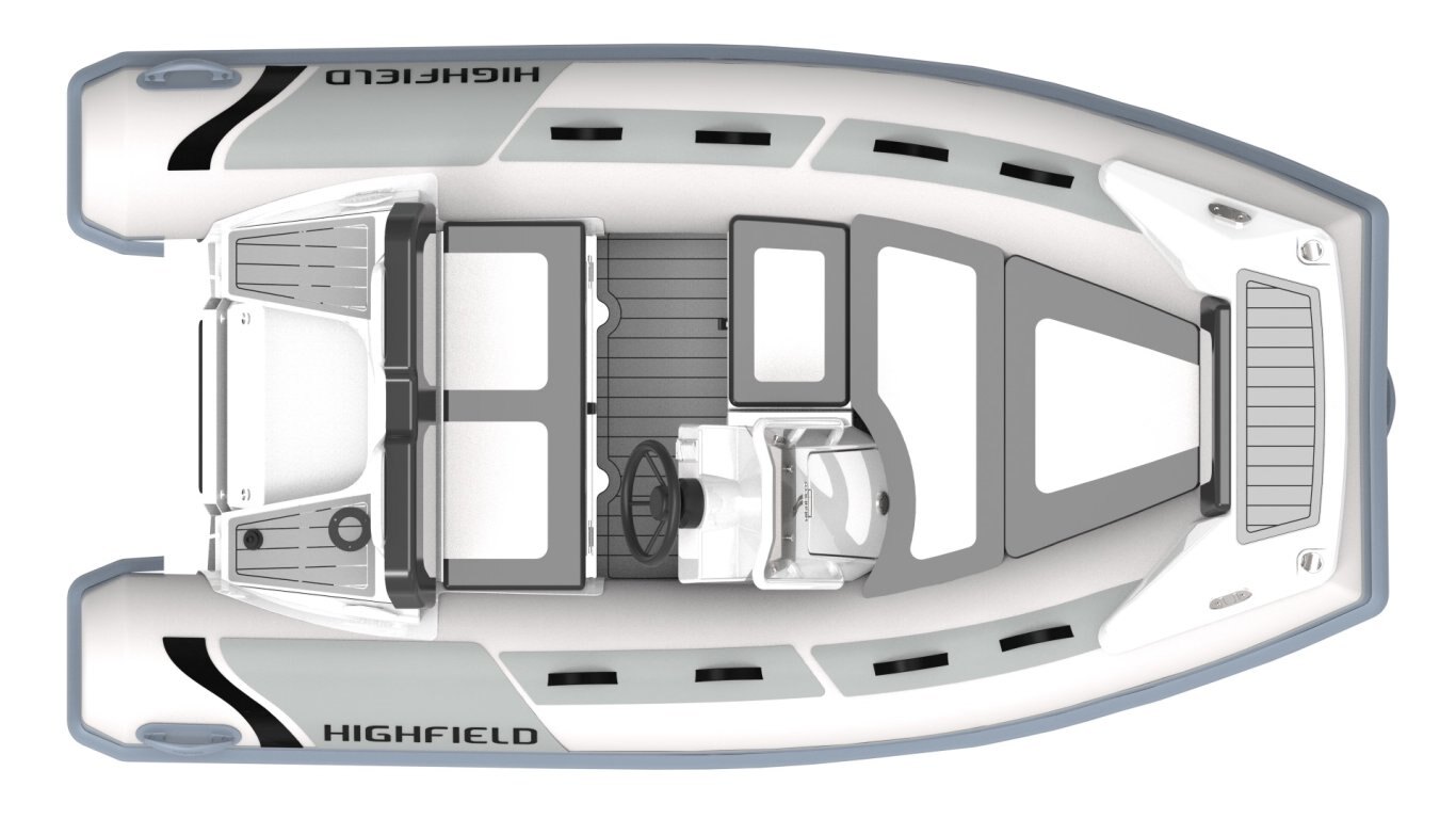 ORCA® Hypalon or PVC tube Flush mount non-return valves High tensile chromated & powder coated aluminum hull Integrated transom supports Steering wheel Lifting points and towing eyes Heavy duty rubbing strake Keel guard Carbon dash for console Welded seams (PVC) Brushed foam teak finish deck Highfield dry bag Foot pump, oars, repair kit Integrated rear seat with cushion Electrical pack for boat & console