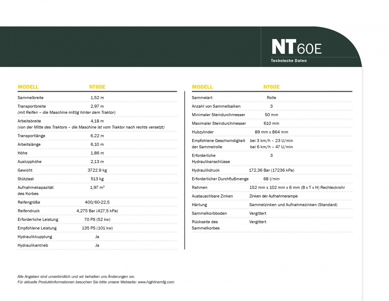Die Hi-Lift Funktion bietet dem Benutzer mehrere Alternativen, die Steine vom Feld zu entfernen. Diese Funktion minimiert den verschwendeten Platz, der durch flache Steinhaufen entsteht, da sich höhere und von der Grundfläche kleinere Haufen schütten lassen oder Steine direkt auf einen LKW zum Entsorgen verladen werden können. Zum einfachen und bequemen Entladen von Steinen, verfügen alle Steinsammler der Marke Highline (NT60) über eine Auskipphöhe von 2,13 m |
