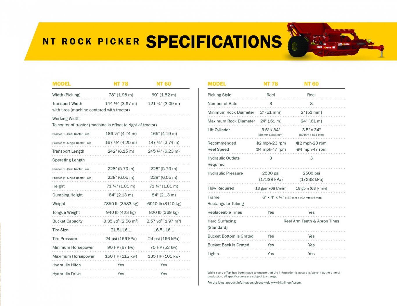 For over 20 years, the Highline Rock Picker has proven itself as a machine that delivers year in, year out. Designed with few moveable parts, as well as extremely durable components, the Highline Rock Picker remains rock solid. Highline offers the all new NT Rock Picker (available in 78”, 60” and 44” sizes), an upgraded unit with a fresh focus on safety and design features that will make your life even easier when taking care of cleaning up your fields. To ensure rocks are firmly picked out of the soil and placed into the bucket, a raking reel is a must. Without a reel and track system, rocks will sling shot past the bucket wasting time back tracking to pick rocks up a second time. Only Highline rock pickers come standard equipped with the advanced track and reel system making a tough job as gentle as possible on the equipment. High-Lift Design The High-Lift design feature provides options for operators to get rocks out of the way or off the field. The High-Lift minimizes wasted space from low flat rock piles by allowing higher more compact piles , or rocks can be transferred directly to a trailer for removal. For fast and convenient rock removal, Highline® rock pickers (NT 78 and NT 60) have a standard dumping height of 84". |