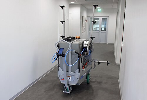 The sprayer unit can also be equipped with de-icing nozzles. The sprayer is installed on a 3-wheel trolley with a 12V battery and 220V charger. This sprayer unit is specially designed with flexible spray bars for schools, hospitals, shopping centres, trains and other public places.
