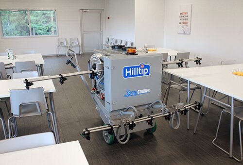 The new Hilltip sanitizer spray machine with a 12V twin pump and a tank system can be used both indoors and outdoors. The M series SprayStriker™ model is manually towed and is designed to pass through all standard door widths ( 80cm).