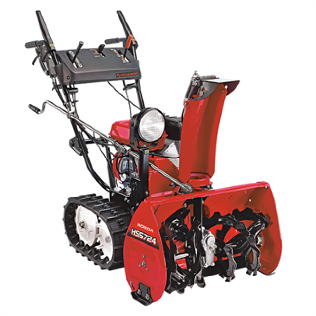 The dual-stage HS724TC is powered by an ultra-robust, GX200, 4-stroke, overhead valve (OHV) Honda engine. It clears a 23.8-inch (60.5-cm) path and throws snow up to 14 m (46 ft.).* It features a variable-speed hydrostatic transmission, which allows you to perfectly match ground speed with the snow conditions for optimum clearing efficiency. Other standard features include a variable, gas-assisted, auger-height-adjustment system, crank-type discharge chute, a work light, quick-release auger, and drive-control levers that allow for one-handed operation, making chute adjustments possible on the go. Also available in a 12 VDC, electric-start model, the HS724TCD. |