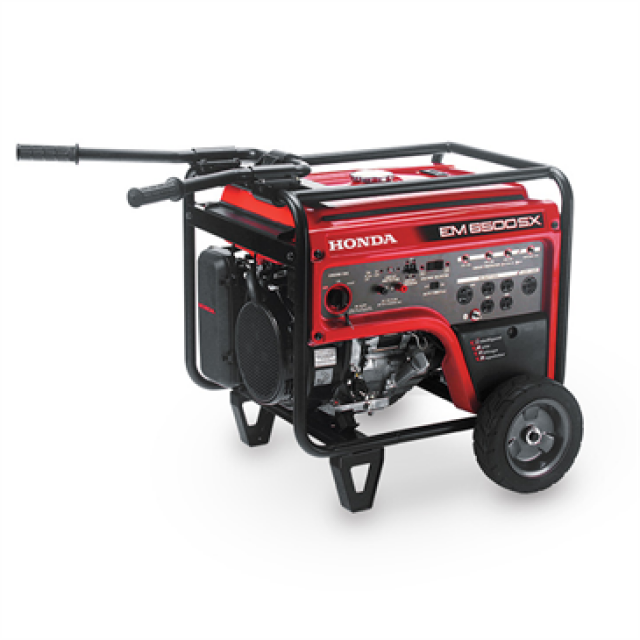 | Honda's premium series EM generators have important features for demanding work on the jobsite or for home backup. The EM6500S2C has convenient 12 VDC electric start with enclosed low maintenance battery, and the Honda exclusive iAVR (Intelligent Auto Voltage Regulation) system for stable power delivery and available extra wattage for special conditions (7000 watts for 10 seconds to start larger equipment). A voltage Selector Switch allows both 120 V and 240 V output, or total output to a single 120 V outlet for powering devices with larger wattage requirements, and the EM6500S2C runs all day without stopping (up to 10.4 hours continuous running time @ 50% load, 6.9 hours at full load with large 24 litre tank). Safety and protection features include a full tubular steel frame with isolation mounts, Oil Alert™ system, USDA-Qualified Spark Arrestor/Muffler and a full 3 year residential and commercial warranty. Additional Features: • Powerful, easy-start Honda iGX390 commercial-grade engine • Auto-throttle further extends running time by automatically adjusting engine speed to idle when under no load • 12 VDC battery charging capability with optional charge cable • Standard Wheel kit with Positive Lock Folding Handles for easy transportation and convenient, compact storage • Cold Climate Technology aids continuous running in cold weather conditions |