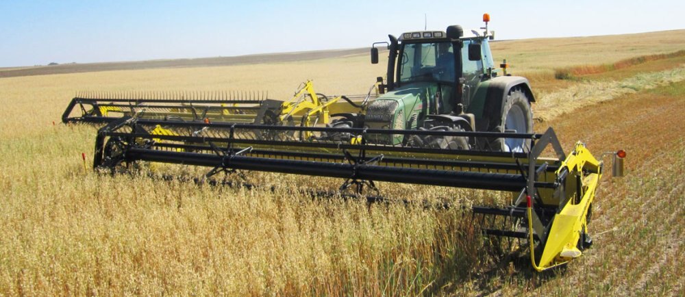 Save time and money with the TM Grain Belt Swather from Honey Bee Unlike other swathers, the TM Grain Belt Swather works on tractors with front-wheel assist so a windrower tractor is not required. It easily attaches to a 3-point hitch on the back and front of your tractor. With two 25′ headers, you'll cover 50′ of cutting space, getting crops off quickly and more efficiently. Laying a swath on the right side of your tractor, you no longer have to constantly look straight behind you to check on your header, just in front and to the right. The TM Grain Belt Swather is also very easy to transport. The side header swings back with ease and it only takes about 20 minutes to mount both units and the same to dismount them, getting you out of one field and on the next in no time. |