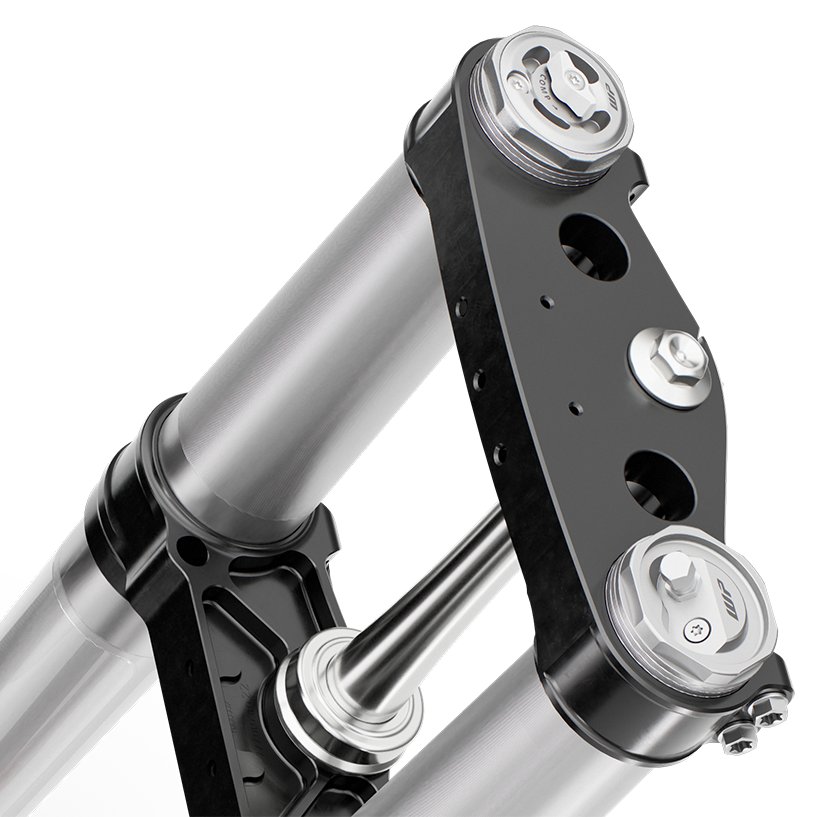 The black-anodized CNC machined triple clamps feature a rubber damping system that reduces vibration, increasing comfort. The triple clamps have been meticulously designed to evenly distribute the clamping force on the fork leg