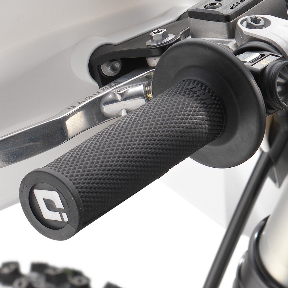 The ODI lock-on grip on the left side does not require gluing, while on the right, the vulcanized grip features an innovative integrated throttle mechanism. The assembly has easy free-play adjustment