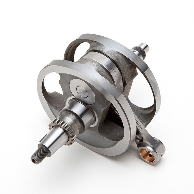 The crankshaft is specifically positioned to harness the rotating mass in the ideal centre of gravity resulting in a lightweight and agile handling feel. As such, the inertia produced by the crankshaft is carefully calculated to deliver optimal traction and rideability from the powerful 450cc plant. A plain big end bearing comprising of two force-fitted bearing shells ensure maximum reliability and durability, guaranteeing long service intervals of 100 hours.
