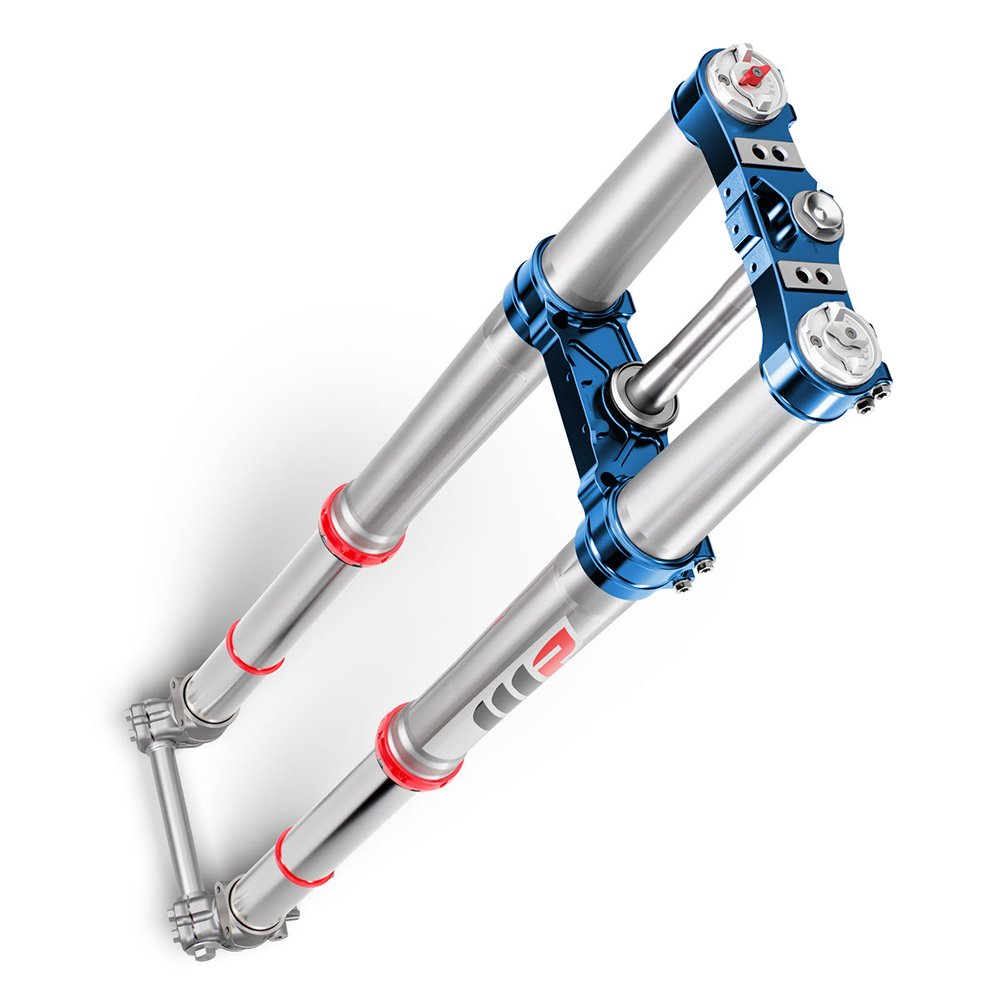 The WP XPLOR 48 front fork is designed specifically for enduro riding. Its open cartridge layout has a spring in each leg with split damping functions. Compression damping in the left leg and rebound damping in the right. Adjustment is via easy-to-access clickers (30 clicks) on the top of each fork leg. The standard preload adjusters allow for easier adjustment without the use of tools. The fork's mid-valve piston delivers consistent damping, while the setting allows the fork to operate higher in the stroke for exceptional rider feedback and bottoming resistance.