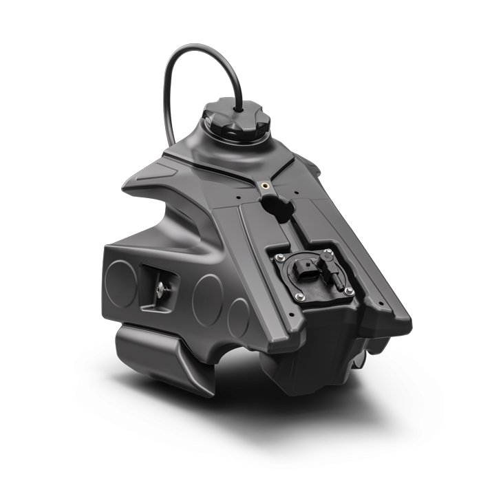 A new and bigger 1.9 gal (7.2 litre) fuel tank integrates neatly into the revised bodywork. Due to the new fuel pump design and position, the tank is emptied further for increased running times. For improved safety, the external fuel line is specifically routed to make it less exposed and susceptible to damage.