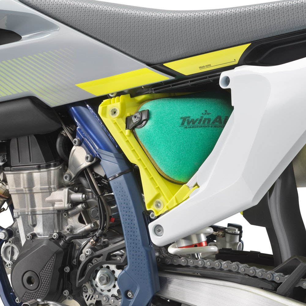 Designed with precisely positioned inlet ducts aimed at reducing drag and air flow deformation, the airbox ensures unrestricted airflow with maximum filter protection. The Twin Air filter is easily accessed without tools, by simply removing the left side panel for easy maintenance. Offering further performance customisation, the FS 450 is delivered with an additional airbox cover that can be changed without the use of any tools for a sharper throttle response according to rider preference or track conditions.