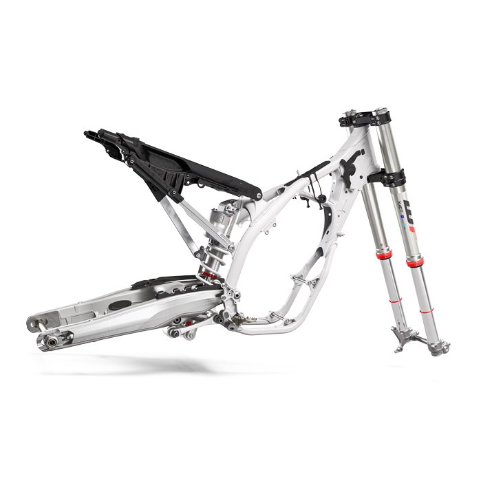 The proven chromium molybdenum steel frame is refined for 2023 to reposition rotational masses inside the engine which together with a new shock mounting position, significantly improves anti-squat behaviour of the chassis. With optimised wall thickness in high-stress areas improving reliability, the frame continues to offer advanced geometries and flex characteristics aimed at providing unparalleled rider feedback, energy absorption, and exceptional straight-line stability. The frame is finished off in a premium white powder coating with redesigned standard frame protectors offering superior protection, durability, and grip in any condition. Additionally, the inclusion of forged brackets on the lower frame rails allows for easy installation of the standard skid plate.