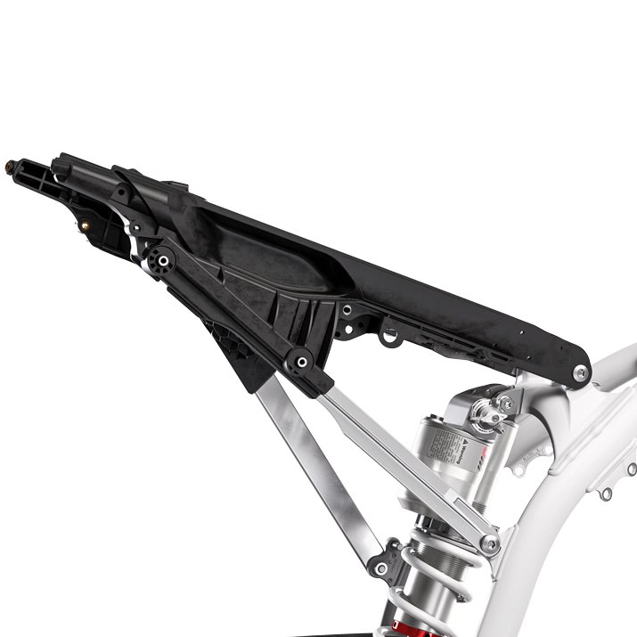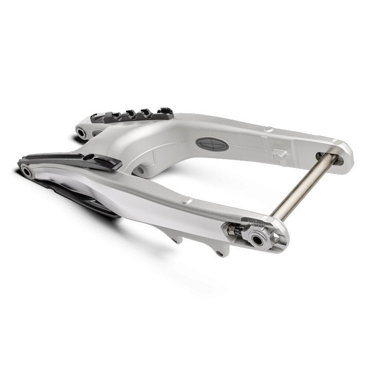 The new hollow die-cast aluminium swingarm is manufactured from a single piece of aluminium using an improved die-cast production process for optimal stiffness and a 190 g weight reduction over previous versions. In order to optimise and match the flex characteristics from the new frame, a new 22 mm rear axle is fitted. Additionally, the chain guard and chain slider have been completely redesigned for improved durability and are less prone to catching on external objects.