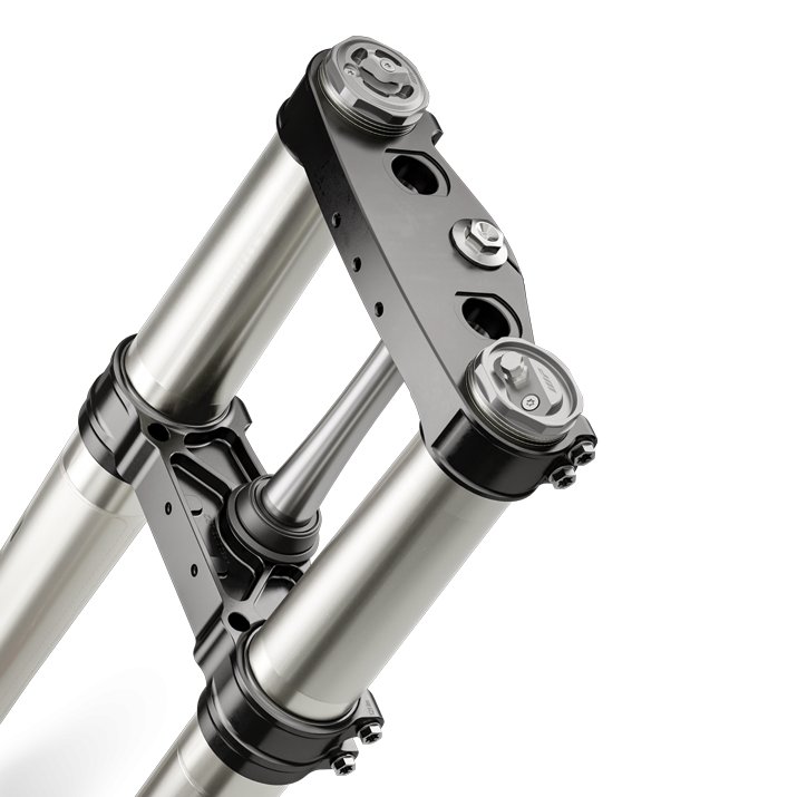 Matching the new frame design and suspension set-up, the CNC-machined triple clamps provide precisely calculated geometry for increased stability. Customised handlebar flex can be achieved by the new handlebar clamp which offers two mounting options - rubber-damped for less vibration or fixed for enhanced front-end feedback. The upper triple clamp is stiffer to ensure a smoother fork action and plays a vital role in the perfect alignment of the front wheel for superior handling.