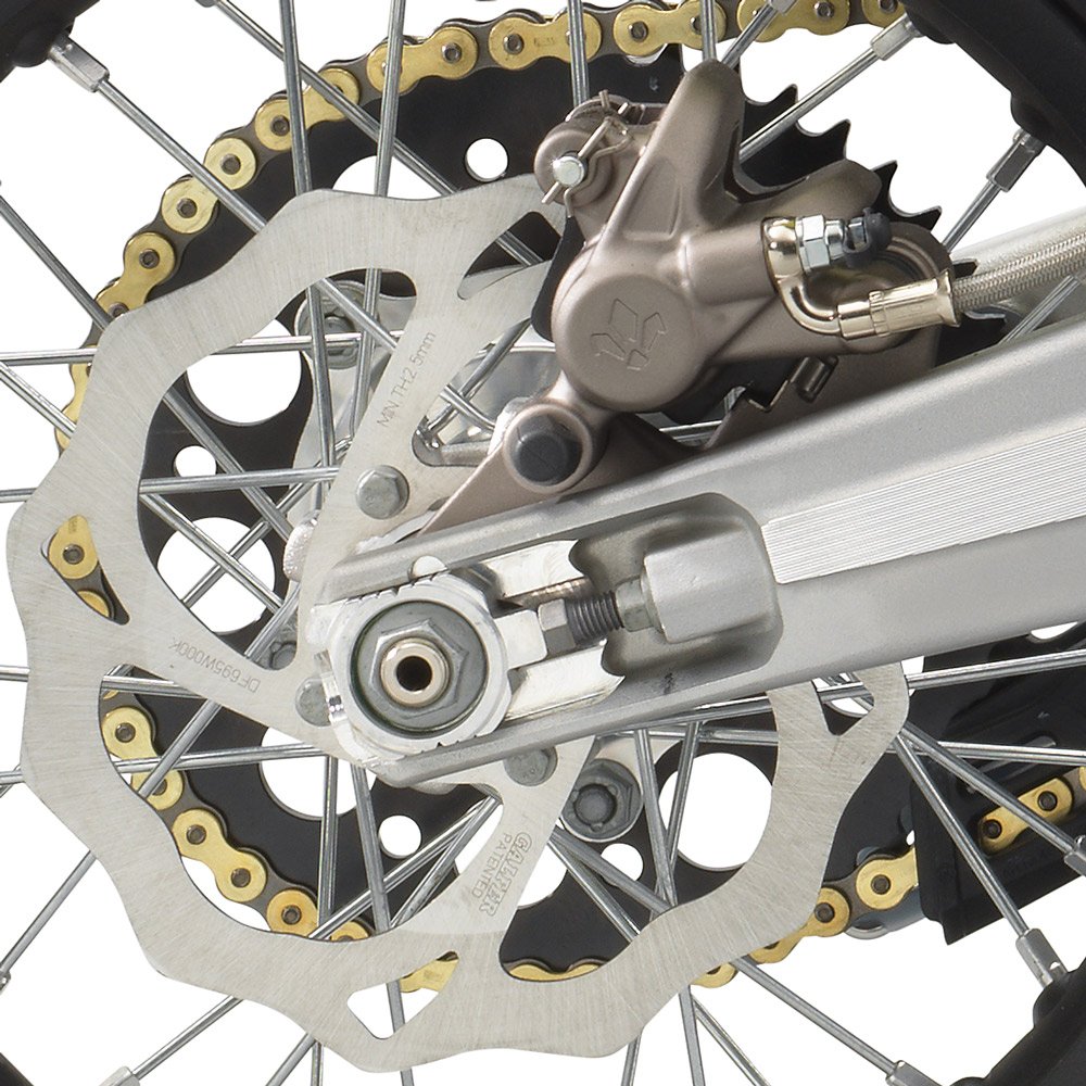 The hollow die-cast aluminum swingarm is manufactured from a single piece of aluminum for optimal stiffness and a 190 g weight reduction over previous generations. In order to optimize and match the flex characteristics of the new frame, a 14 mm rear axle is fitted. Additionally, the chain guard and chain slider are designed to prevent mud from building up around the swingarm. |