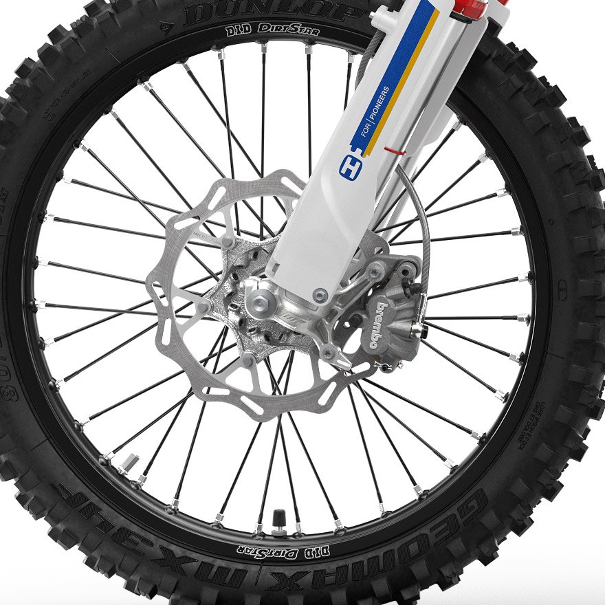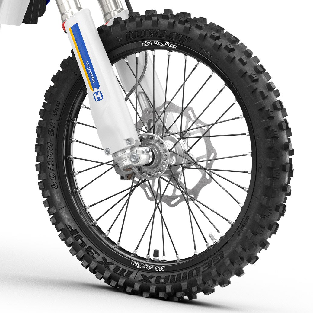 Assembled with CNC-machined hubs, strong spokes, and black-anodised alloy rims by D.I.D, the wheels of the FC 450 are fitted with DUNLOP GEOMAX MX33 Motocross tyres which feature a proven block-within-a-block design for more progressive cornering and superior grip. For increased traction and stability through ruts, the FC 450 is fitted with a 120/90-19 rear tyre while a 80/100-21 front tyre ensures optimal grip on a variety of riding surfaces. |