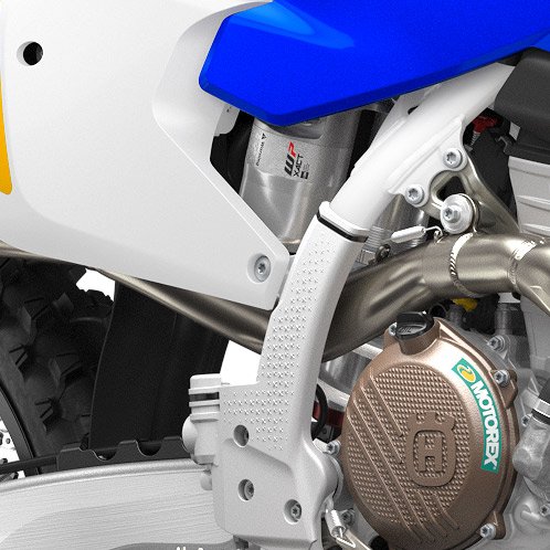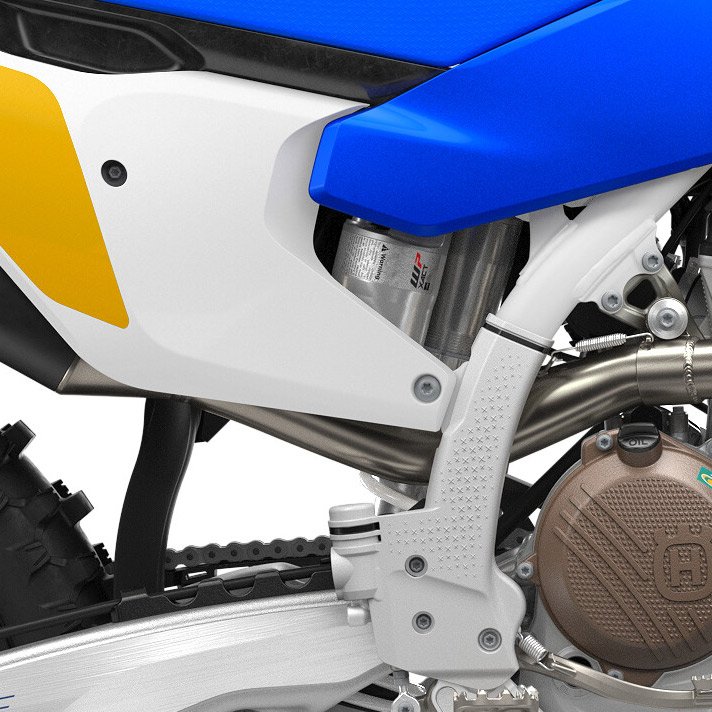 Lightweight frameThe proven chromium molybdenum steel frame is refined for 2023. A new shock mounting, which is no longer connected to the main tube, significantly improves the anti-squat behaviour of the chassis. With optimised wall thickness in high stress areas improving reliability, the frame continues to offer advanced geometries and flex characteristics aimed at providing unparalleled rider feedback, energy absorption, and exceptional straight-line stability. The frame is finished off in a premium white powder coating with redesigned standard frame protectors offering superior protection, durability, and grip in any condition. Additionally, the inclusion of forged brackets on the lower frame rails allows for easy installation of the skid plate, which is available as a technical