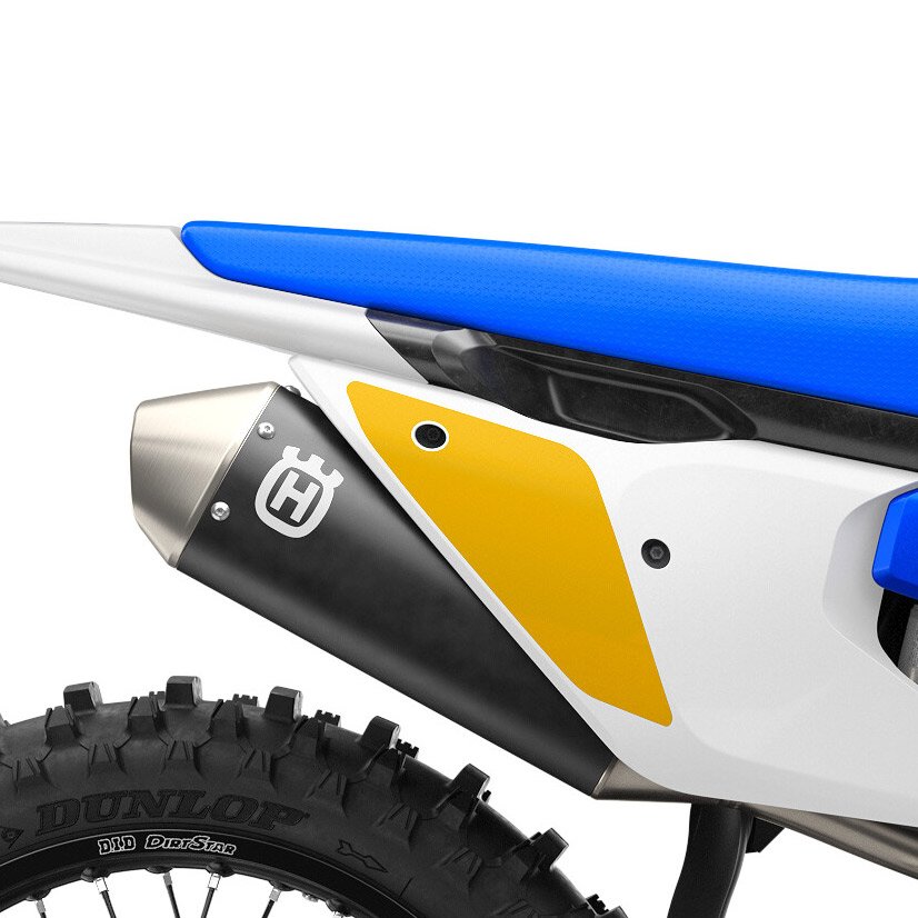 The exhaust system on the FC 350 Heritage model features a flow-designed resonance chamber, which plays a vital role in delivering class-leading performance. Manufactured in two pieces and designed to be as compact as possible, the header pipe allows for the system to be removed without removing the rear shock. The silencer has a short and efficient design, moving weight closer to the centre of gravity and ensuring impressive power while keeping noise as low as possible. A black coating highlights the premium quality of the silencer. |